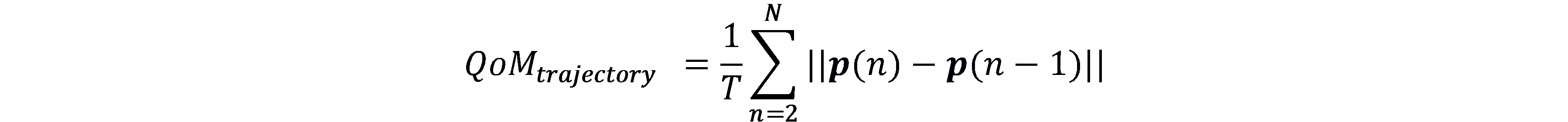 where p is the XYZ position vector of a marker, N is the total number of samples, and T is the total duration of the recording. We calculated the global QoM by summing the QoM of all trajectories and normalizing the value by the number of recorded markers (P):