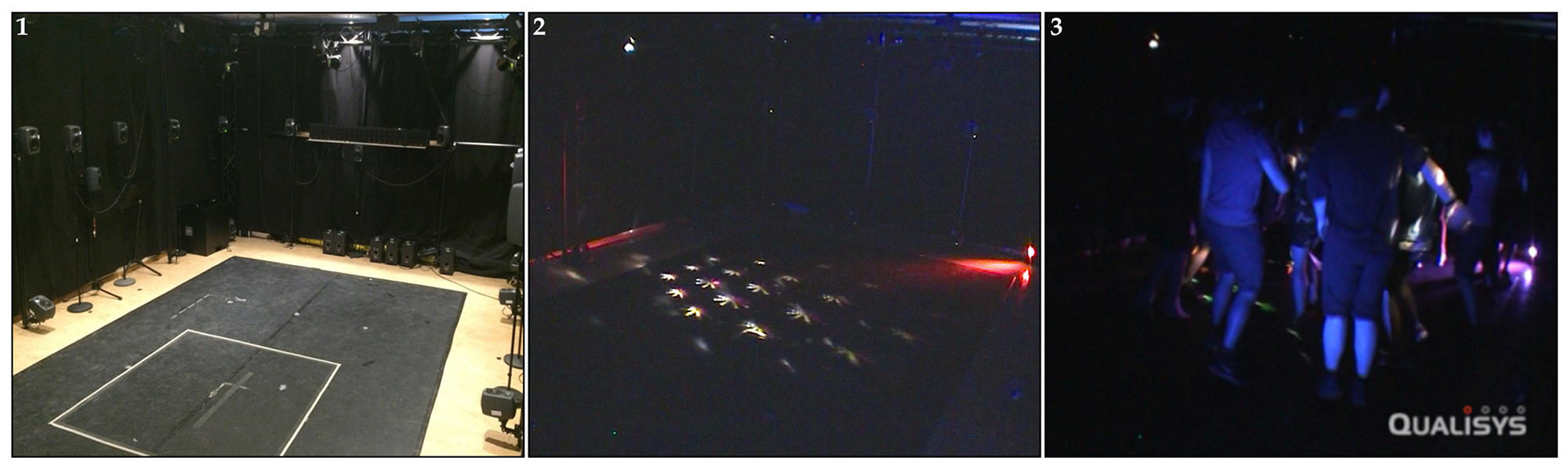 As mentioned previously, ecological validity was our main concern in the design of the experiment's setting. The experiment was carried out in the evening on a warm summer day using real (and loud) dance music. We tried to make the whole experience feel as natural as possible, even though the participants had to give their consent and be equipped with markers when they entered the space. Because they were restricted to a small dance space, they had to dance relatively close to one another, just as they would in an actual club setting. The participants reported that they found the experiment enjoyable and fun.