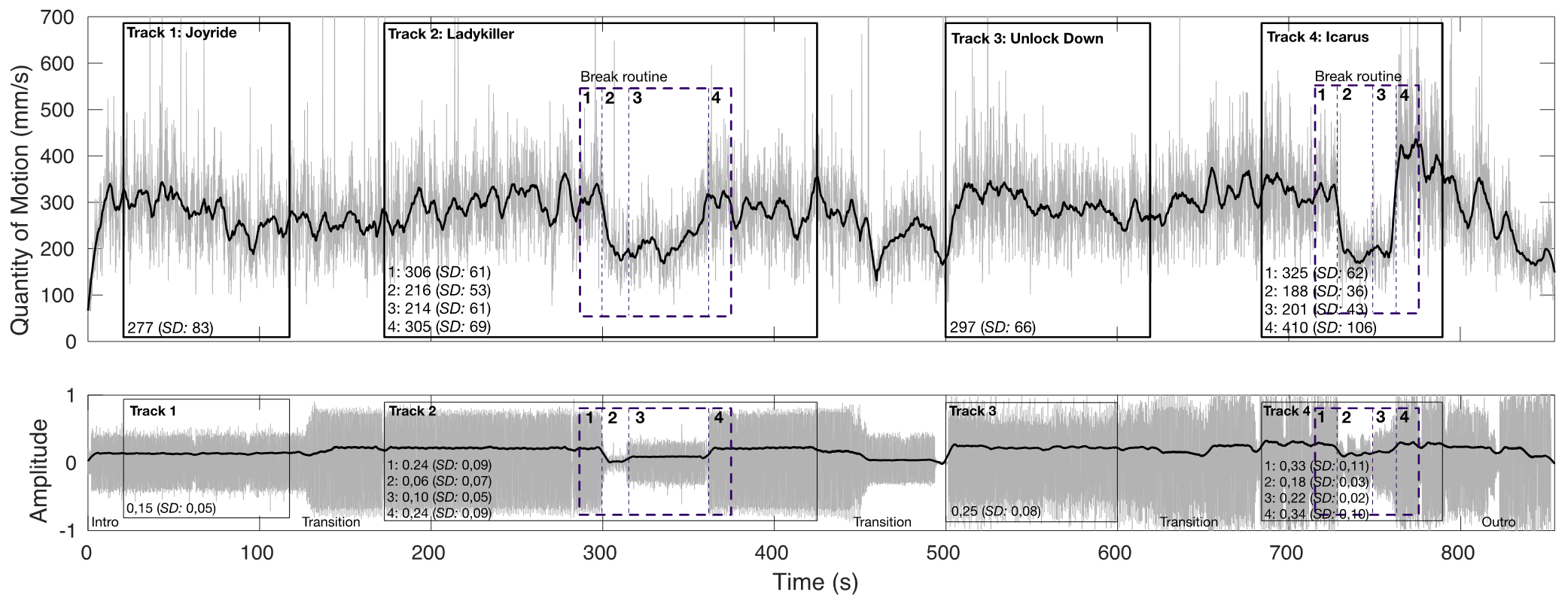 The figure also presents an amplitude plot of the audio track, including a filtered root-mean-square (RMS) plot (10-second Savitzky-Golay filter) for reference. We can see from Figure 2 that the group's mean QoM is relatively stable throughout the session, with an average value of 257 mm/s for the entire recording and 286 mm/s for the four main segments. There are, however, some interesting moments in the recording, most notably during tracks 2 and 4. Both of these tracks have break routines, and in both instances the plots show a sudden and large decrease followed by an increase in QoM after the drop. More gradual changes in the QoM of the dancers occur in the transitions between the tracks, which follow the same gradual dynamic changes in the music, due to the tracks being mixed into one another.