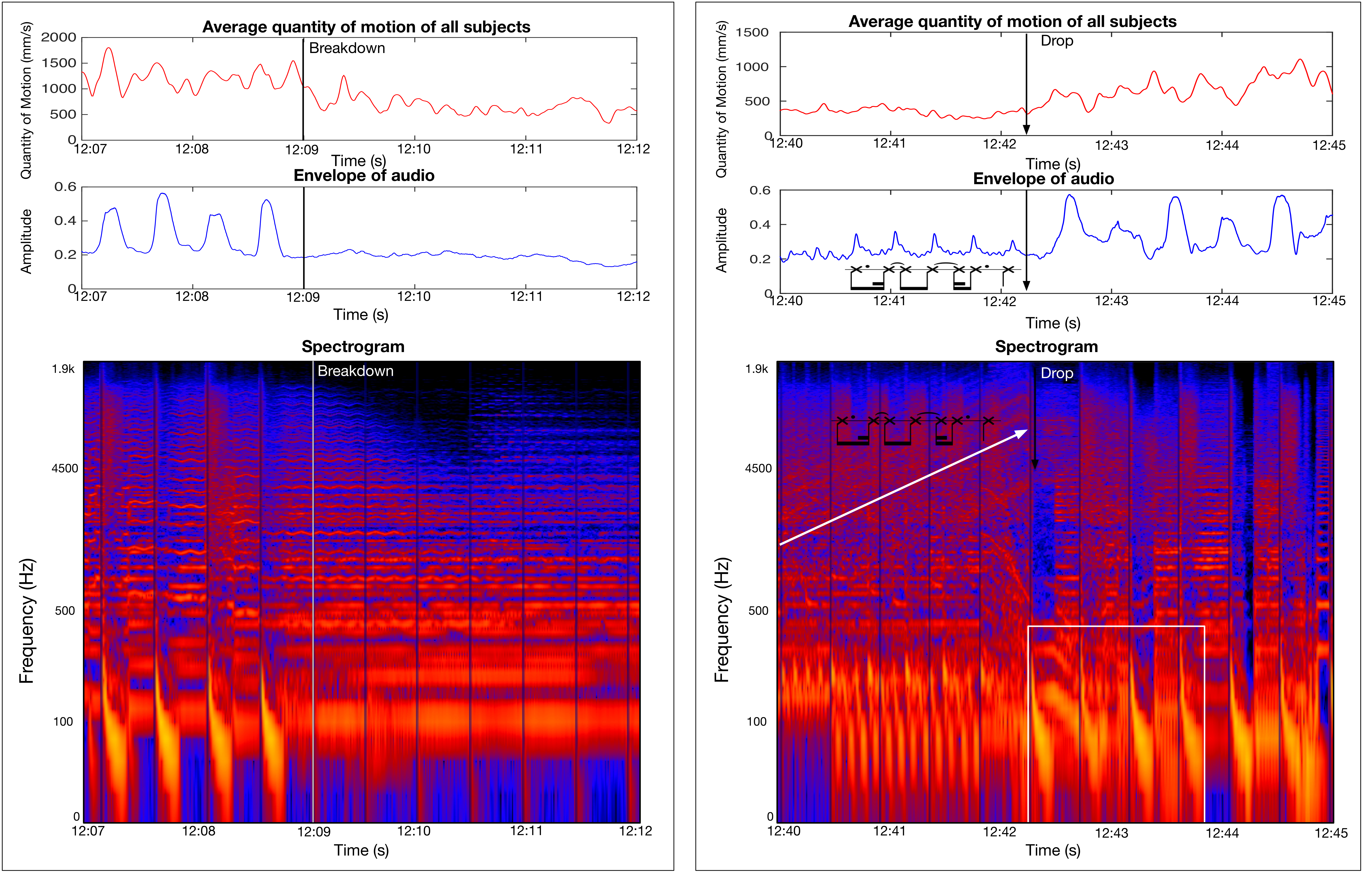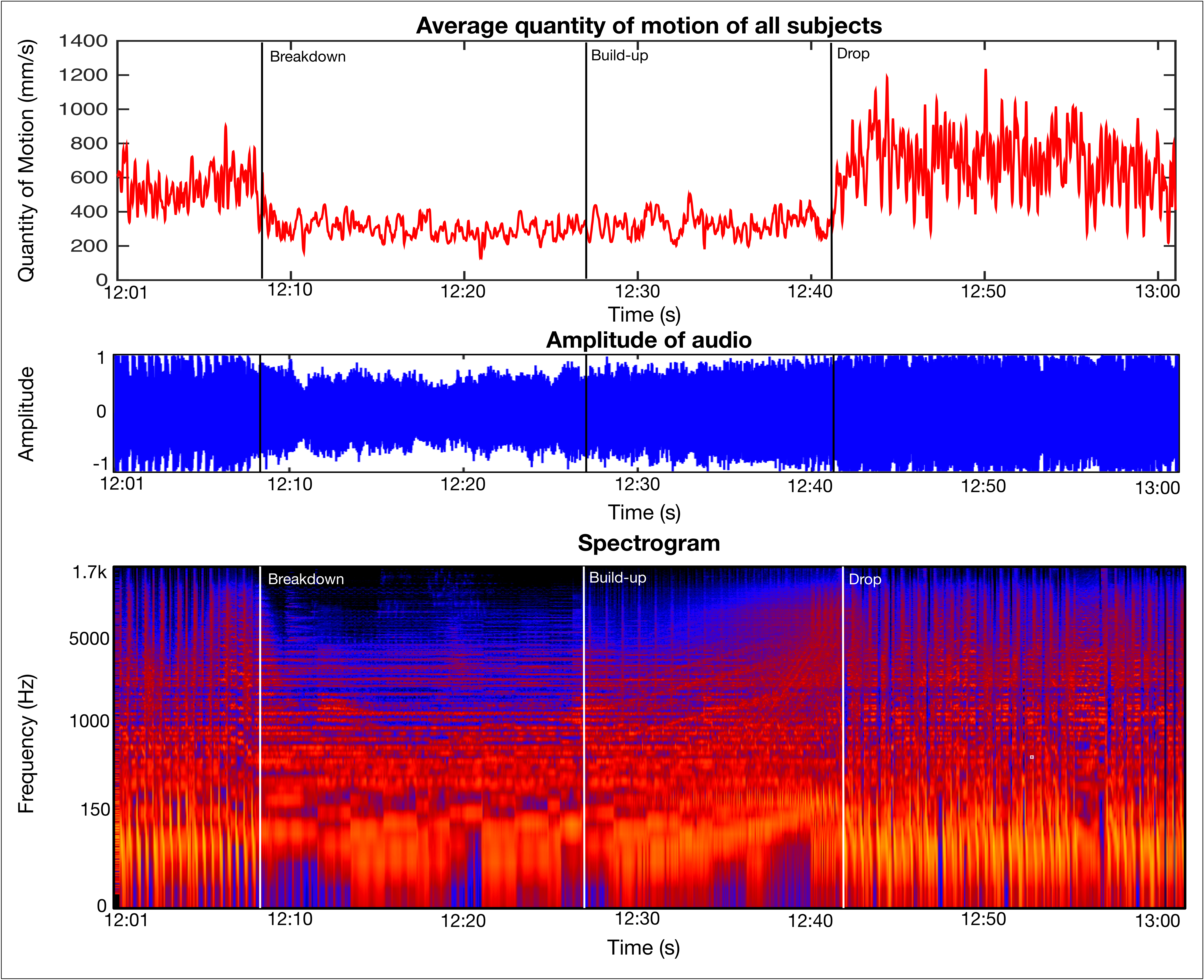 The plots demonstrate a considerable decrease in the group's activity level when the breakdown sets in, along with a pronounced increase at the moment of the drop. It is interesting to see that the average QoM after the drop in "Icarus" is higher than the average QoM before the breakdown and build-up occurred. This indicates that these passages "energize" the group and its dancing. A qualitative analysis of the video recording of the session reveals that the quality of the dance movement also changes: the group moves with smaller, fewer, more fluid movements in the breakdown, as opposed to the drop, when the movements become larger, more pronounced, and more synchronized with the beat. Our results here support the idea that the dynamic level of the bass drum has a pronounced effect on people's bodily behavior when dancing together in groups (Van Dyck, Moelants et al., 2013).