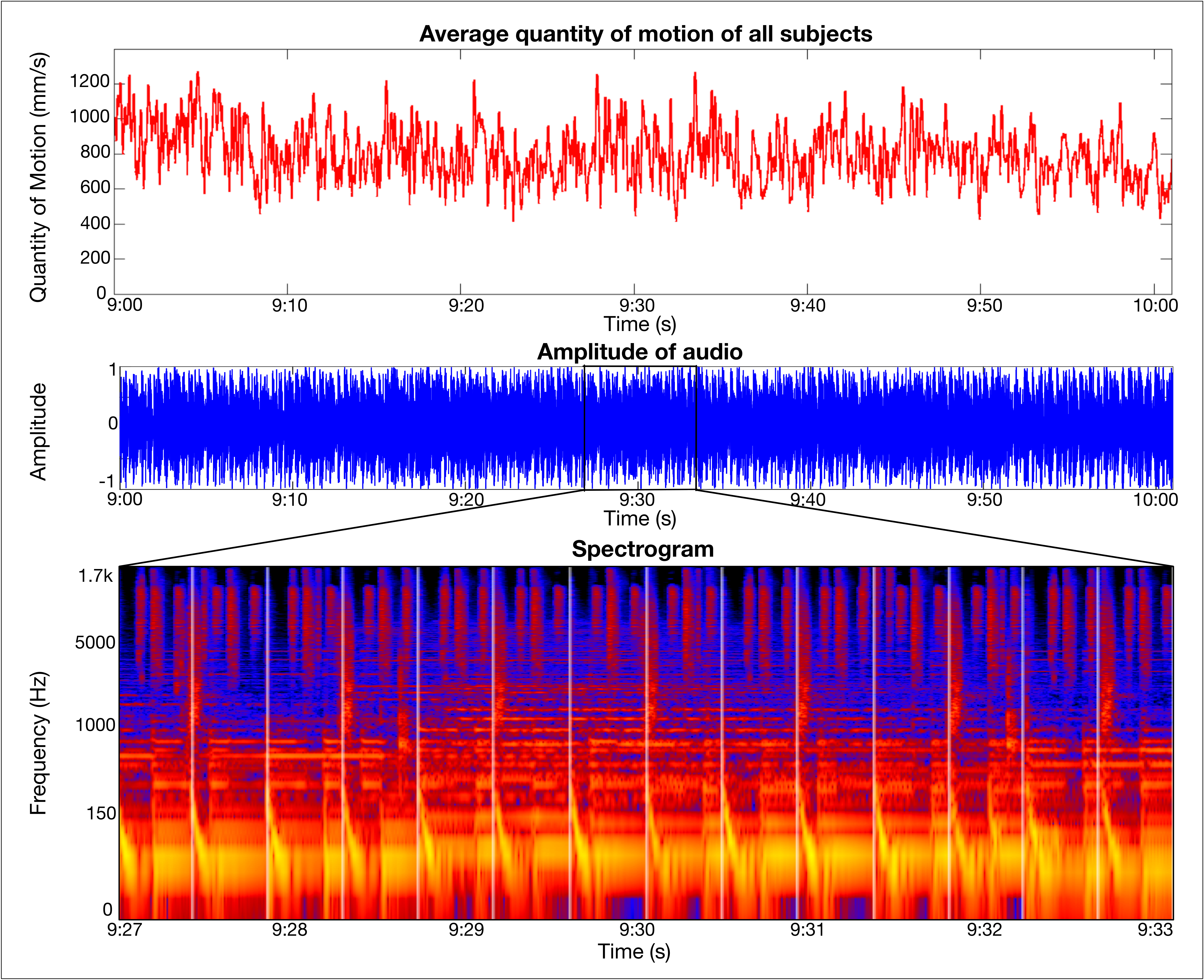 Fig. 3. Plots of the quantity of motion for all subjects, and the amplitude and log spectrogram of the sound of the break routine of "Icarus," consisting of breakdown, build-up, and drop. In the original track, the breakdown begins at 02:02 and the build-up at 02:21, while the drop occurs at 02:36.