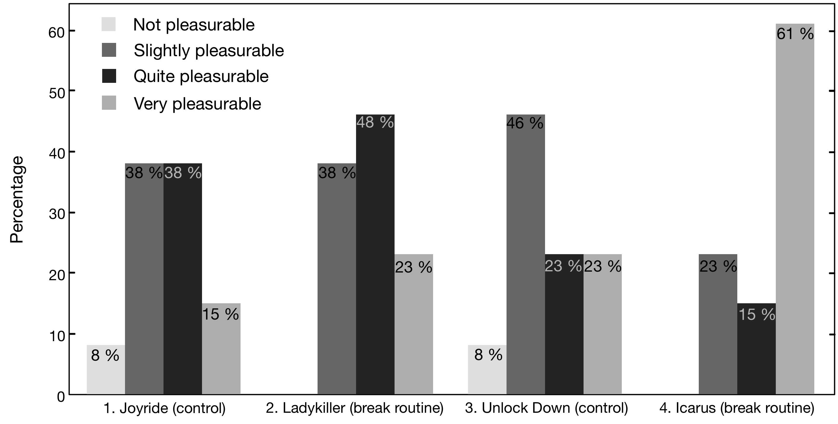 The analysis of the questionnaires shows that the two tracks with the break routine were rated as more pleasurable than the tracks with a flat structural development. The pleasure ratings for all four tracks are summarized in Figure 6. Most of the participants (61%) rated "Icarus" as "very pleasurable." "Ladykiller" was rated as "quite" to "very pleasurable" by 69% of the participants while "Icarus" is rated the same by 78% of the group. The control tracks did not score as high in the same pleasure categories—"Joyride" (53%) and "Unlock Down" (46%). None of the participants found "Icarus" or "Ladykiller" to be "not pleasurable," and only a small percentage found "Unlock Down" (8%) and "Joyride" (8%) to be "not pleasurable."