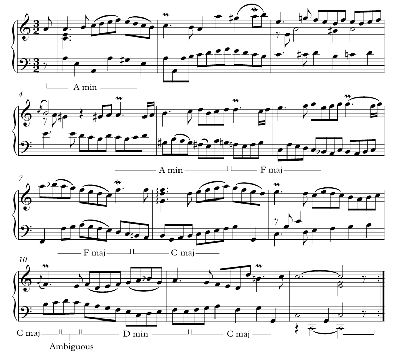 Figure 2. J. S. Bach, English Suite no. 2 in A minor, BWV 807, Courante, mm. 1–12, showing the key areas as encoded in the YCAC by the Bellman-Budge key-finding algorithm.