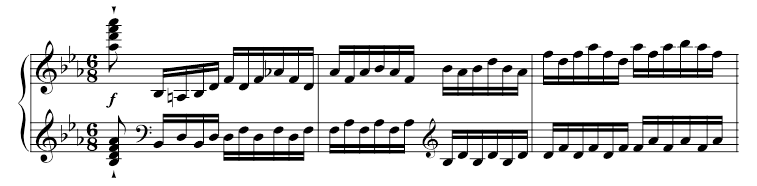 To better assess the operation of the key-finding algorithm, I thought it would be worthwhile to examine another composition in the corpus. I chose next to look at the first piece in the second file in the first folder: movement 2 from Beethoven's Piano Sonata no. 26, op. 81a. As it turns out, this particular piece is quite thorny with regard to key areas. For example, while the global tonic of the piece is ostensibly C minor, there are only four bars at the beginning (mm. 5-8), a brief moment in the middle (the last half of m. 20), and four bars at the end (mm. 37-40) that are clearly in C minor, at least to my ears. Assessing the accuracy of the key-finding algorithm in this highly chromatic and modulatory setting seemed somewhat unfair. Accordingly, I moved on to the second piece in the second file in the first folder: the third movement from the same work (Beethoven Piano Sonata no. 26, op. 81a). The first few bars of this movement are reproduced below in Figure 3.