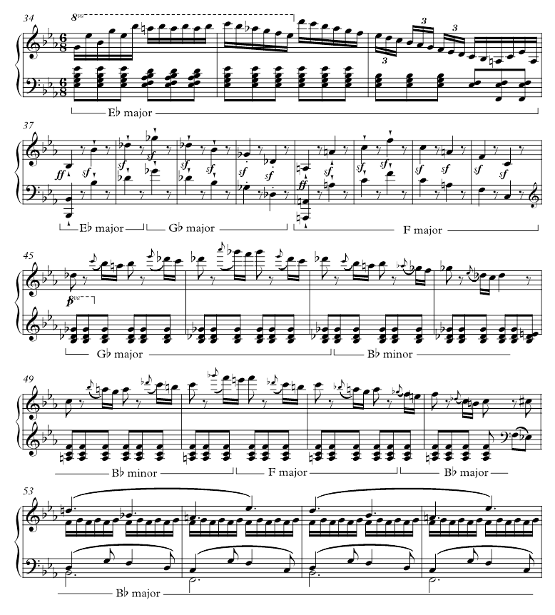 For those readers unfamiliar with this piece, it is worth noting that the arpeggiation of what is an obvious dominant-seventh chord continues for the first 10 bars of the movement, followed by the first instance of the E-flat major tonic on the downbeat of bar 11. Unfortunately, because the key-finding algorithm prefers a scale-degree distribution that maps the most frequently-occurring scale-degrees to a tonic chord, the first seven and a half measures of the piece are analyzed as in B-flat major. The key-finding algorithm does get on track, however, by the middle of bar 8. The music stays in E-flat major for about the next 26 bars (up until bar 36 or so), and the key-finding algorithm does label these bars correctly as in E-flat major since there is only a bit of brief tonicization via a few V/ii chords, none of which last longer than a single beat. The situation gets somewhat more complicated around bar 36, however, as the music modulates to the dominant key area of B-flat major. I have reproduced the transition passage below in Figure 4, which includes the key areas encoded in the YCAC by the Bellman-Budge algorithm.