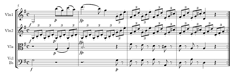 For the sake of argument, at least, let us simply presume that the key-finding algorithm models our hearing very well. The next step would be to investigate how the proportion of V and V7 chords might be tallied in a work from the corpus. Consider, for example, the consequent phrase from the parallel period that opens the second movement of Mozart's Symphony no. 7, as shown in Figure 5. I will assume here that the consequent phrase modulates from G major to the key of D major. Given this modulation, I hear two V7 chords in this passage: the first during beat 4 of bar 7, the second during beat 2 of bar 8. Assuming the modulation occurs prior to the downbeat of bar 7 (which is how the Bellman-Budge algorithm analyzes this passage), I would not label any instances of a simple V triad here.
