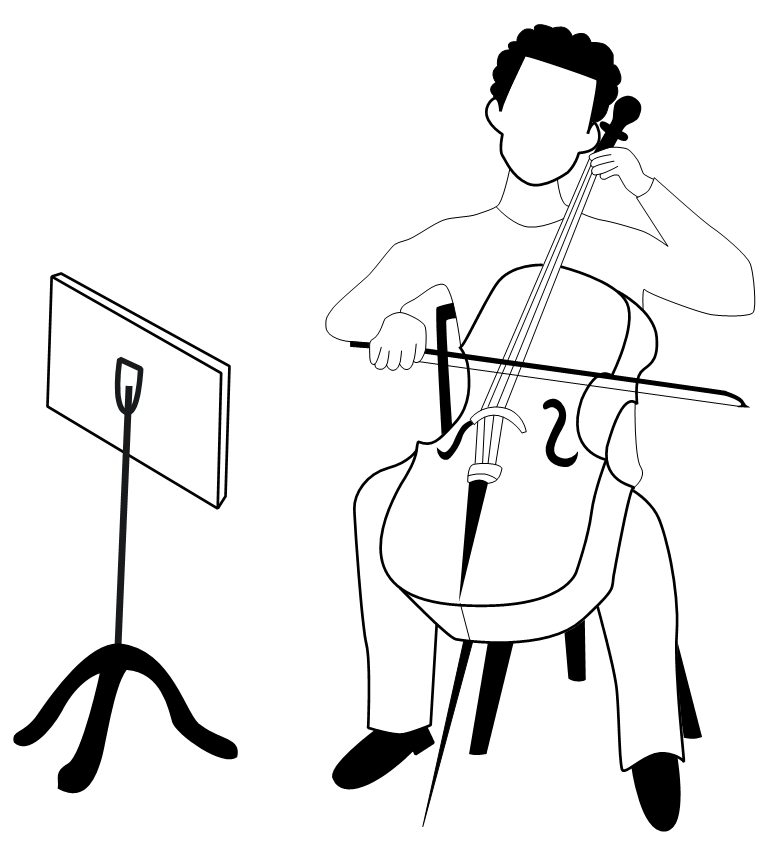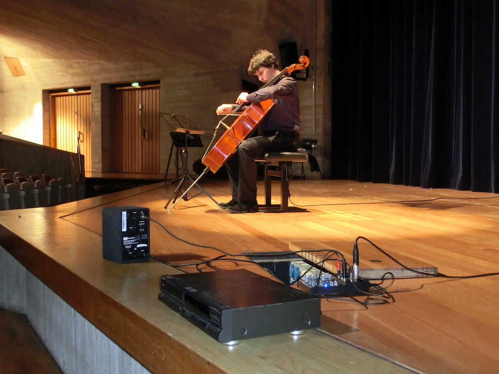 The beginnings of two works for violoncello solo by J. S. Bach (Prelude from BWV 1007 and Gigue from BWV 1009) were selected for the experiment, as they are part of a professional cellist's standard repertoire. Both pieces were well-rehearsed and memorized by an advanced male music student, who was a different cellist than in the original study by Williamon (1999). An audio track was pre-recorded in the same concert hall as used for the later video recording. The cellist obtained audio tracks of both pieces one week before the video recordings in order to practice a playback performance to his own recordings.