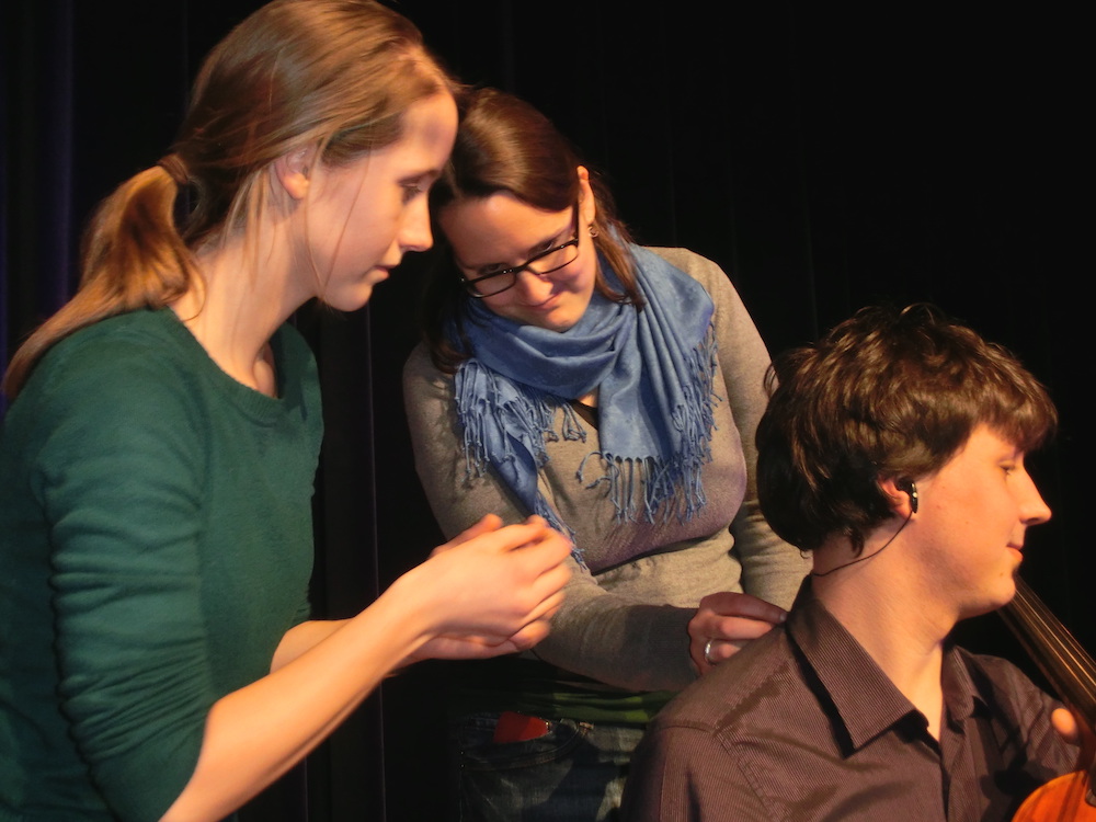 Fig. 1a (left) and b (right). The left picture shows the setup for the video recording of both pieces. For better synchronization in the video post processing, the pre-recorded audio track with preceding click counter was sourced for the camera microphone via CD player. The right picture shows the preparation of the performer with an in-ear monitor fixed to his right ear. The monitor cable was adhered to his neck and was guided down his back such that all the technical equipment was invisible to the video observer.