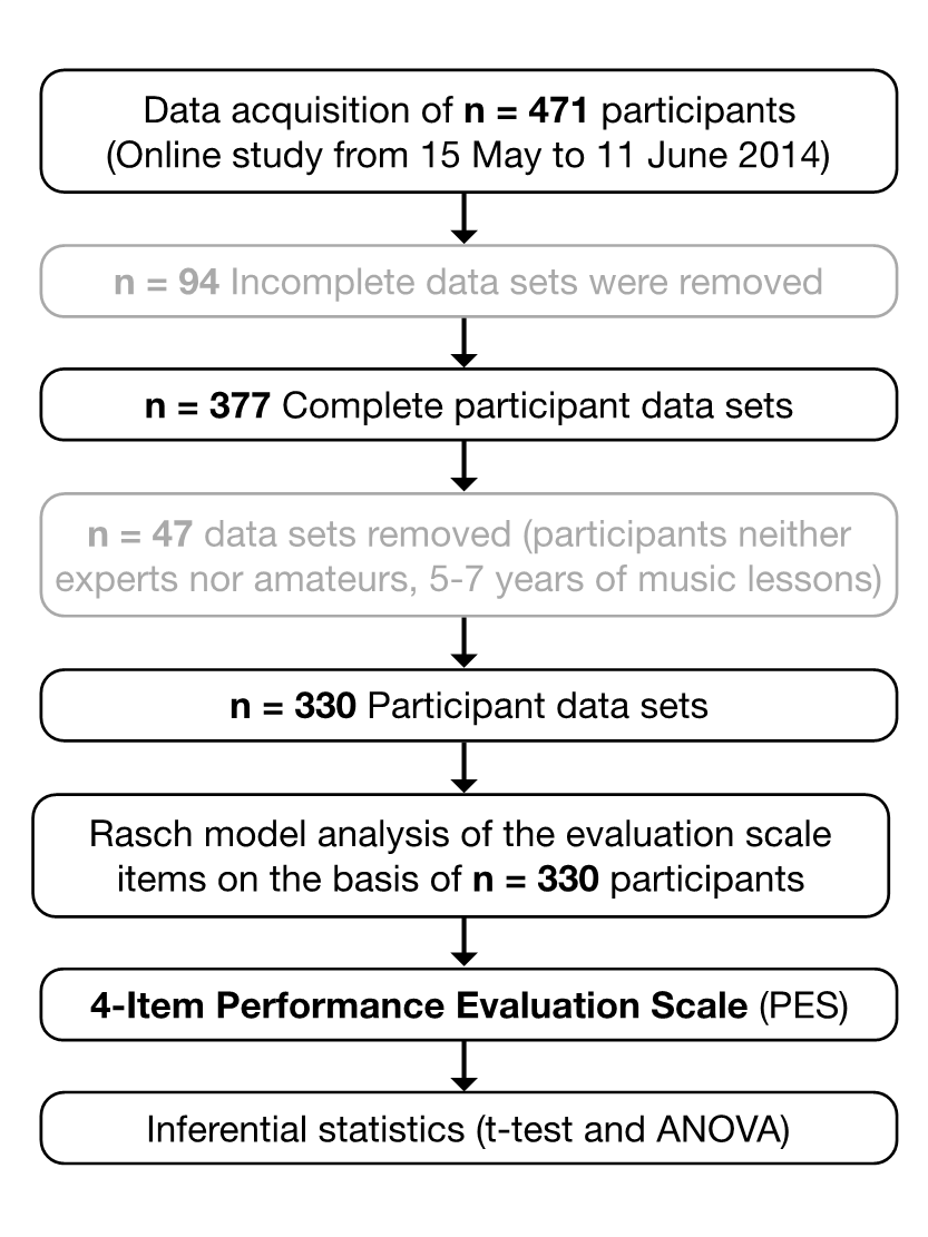 Furthermore, we could not find a significant difference in the evaluations of musical experts and amateurs and had to dismiss our hypothesis that less musically sophisticated observers would be more impressed by the performer's playing from memory. As a by-product of our study, the development of a 4-item Performance Evaluation Scale might be a sustainable contribution to the future elaboration of a more comprehensive evaluation tool. To the best of our knowledge, there is currently no inventory for the evaluation of music performance that is compatible with the highest standards of probabilistic test theory. The suggested items of the PES might be a first step in this direction.