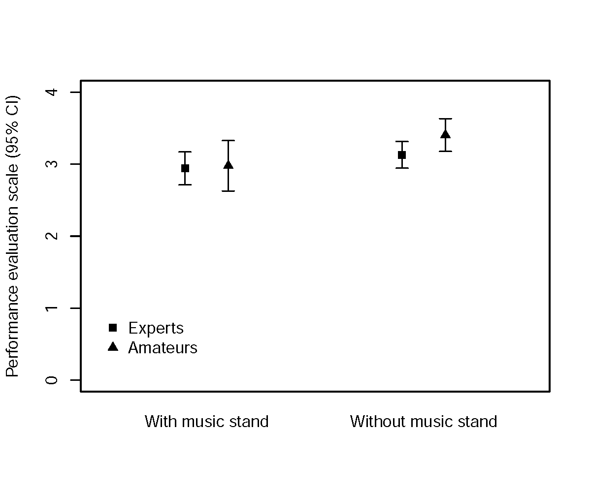 Although we had hypothesized that less sophisticated participants (musical amateurs) would provide higher evaluations in the condition without music stands, the error bar diagram (Figure 5) shows a different result: The interaction between Performance Presentation × Degree of Sophistication revealed only small differences between groups, which were not statistically significant (see Table 3 for descriptive statistics).