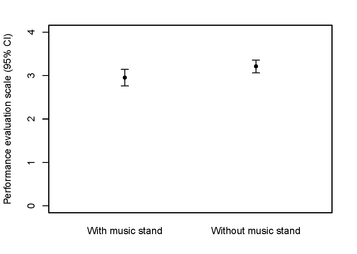 Surprisingly, only a small number of empirical studies address the challenging questions of how and if performance evaluation of classical music is influenced by the presence of a music stand. As Platz and Kopiez (2012) revealed in a meta-analysis, visual information can contribute significantly to the overall evaluation of an audio-visual performance by about 0.5 standard deviations. A visible score or music stand might be an important visual component of a live music performance, along with clothing (Griffiths, 2008, 2009), expressive movements and physical appearance (Davidson, 1993; Davidson & da Costa Coimbra, 2001; Tsay, 2013), attractiveness (Ryan & Costa-Giomi, 2004; Ryan, Wapnick, Lacaille, & Darrow, 2006), unconventional playing techniques (Lehmann & Kopiez, 2013), visible signs of engagement (Behne, 1994b), facial expressions (Thompson, Graham, & Russo, 2005; Thompson & Russo, 2007) and conductor gestures (Wöllner, 2008; Wöllner & Auhagen, 2008). In a study on the influence of first impressions on the audience's motivation to continue the performance evaluation, Platz and Kopiez (2013) showed that the visual cue of a score or music stand could very well have an influence on this process.