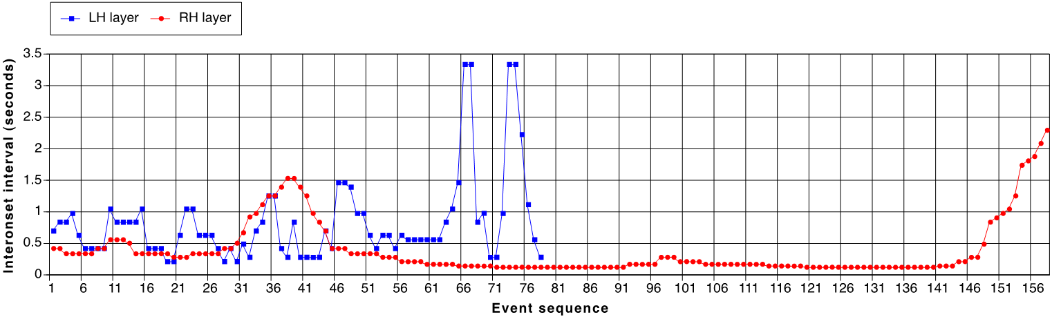 The excerpt extends from m. 68, fourth eighth note, to m. 88, fifth sixteenth note, inclusive; a reproduction of the entire excerpt is included as Appendix A and B. Figure 1 presents each of the two layers as an IOI series. In the original score, the passage is notated with a 4/4 time signature and a prescribed tempo of quarter note equal to 72 bpm; its mechanical performance lasts about one minute. The two component layers correspond roughly to the right and left hands of the pianist (designated RH and LH in Figure 1), although the two parts cross in register a few times. The right-hand layer consists of a mostly stepwise but sweeping melody built from subdivisions of an underlying 1:2 duration pattern; in notational value, these subdivisions range from septuplet sixteenth to triplet quarter notes. This temporal design suggests at least two nested pulse levels in a 3:1 ratio, that is, a quarter note at 72 bpm and a dotted-half note at 24 bpm, corresponding to chronometric durations of 0.833 and 2.5 sec, respectively. The left-hand layer consists of an accompaniment with regularly accented lower tones whose IOIs correspond to a SOP of 18 bpm (3.333 sec), the rate and duration associated with the whole note. These slow pulsations alternate with short staccato notes in a higher register, most of which are notated as triplet eighth and sixteenth notes, resulting in a highly irregular rhythmic sequence. The compound layer suggests measures of four quarter notes at 72 bpm, and this structure is explicitly presented only once toward the beginning of the passage (from m. 70, fourth eighth note, to m. 71, third eighth note). Table 1 presents the range of notational values used in both layers, with the corresponding IOIs (in msec) and tempi (in bpm).