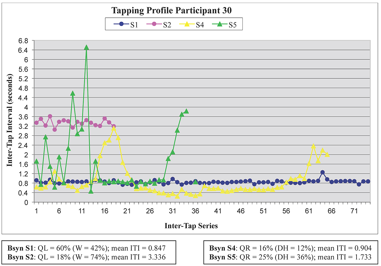 Fig. 4. Participant 30's tapping profile for the four trials in block 1 (S1 = L-off; S2 = L-on; S4 = R-off; S5 = R-on). Beat synchronization percentages (Bsyn) for the beat and measure pulse levels along with the mean inter-tap intervals (ITI) for each trial are given below the graph (QL/QR = quarter note; DH = dotted-half note; W = whole note). The left-hand tapping contours (S1 and S2) are representative of mensurally determinate tapping behavior, with a change of tapping period associated with the addition of accents at the whole-note pulse level (S2); the right-hand tapping contours (S4 and S5) are more variable, with temporary beat percepts that are only partially consonant with the implied beat structure.