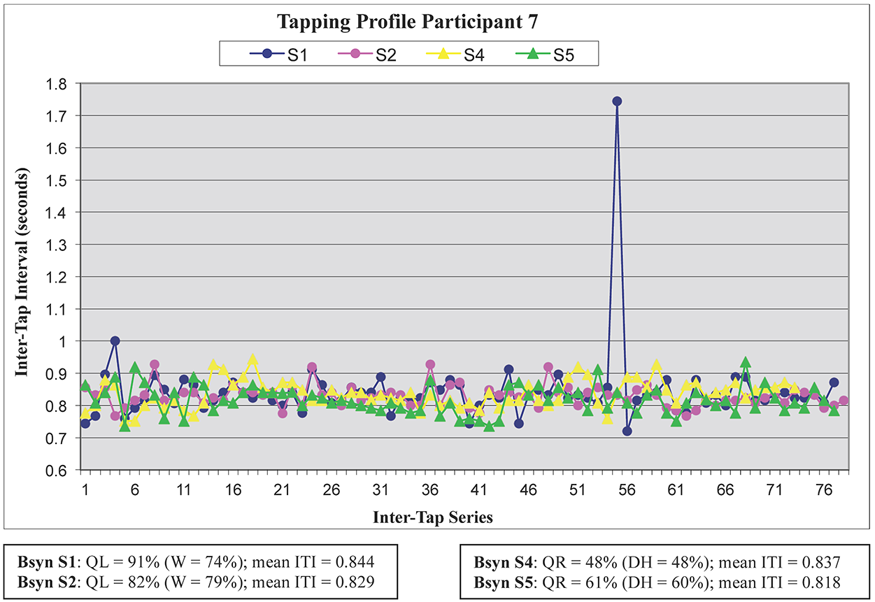 In contrast, the tapping contours of Participant 7 (see Figure 5) are very similar across both layer and accent conditions, as attested to by the narrow range of their associated tapping periods (M = 818–844 msec). In fact, this participant's tapping behavior was remarkable both in its consistency and accuracy, with an overall coefficient of variability of merely 0.069 and beat synchronization percentages similar to those found in previous tapping studies using actual music as source materials (e.g., Snyder & Krumhansl, 2001). This tapping profile is also representative of the overall finding that the left-hand layer (S1 and S2) was perceived as more mensurally determinate than the right-hand layer, the latter exhibiting mensural determinacy only when it was accented (S5) or combined with the left-hand layer (not represented in this figure). The beat synchronization percentages displayed in Figure 5 also suggest that when tapping to the unaccented left-hand layer, this participant's beat percepts were more attuned to the quarter-note beat (BsynQL = 91%) than the whole-note pulse level (BsynW = 74%).