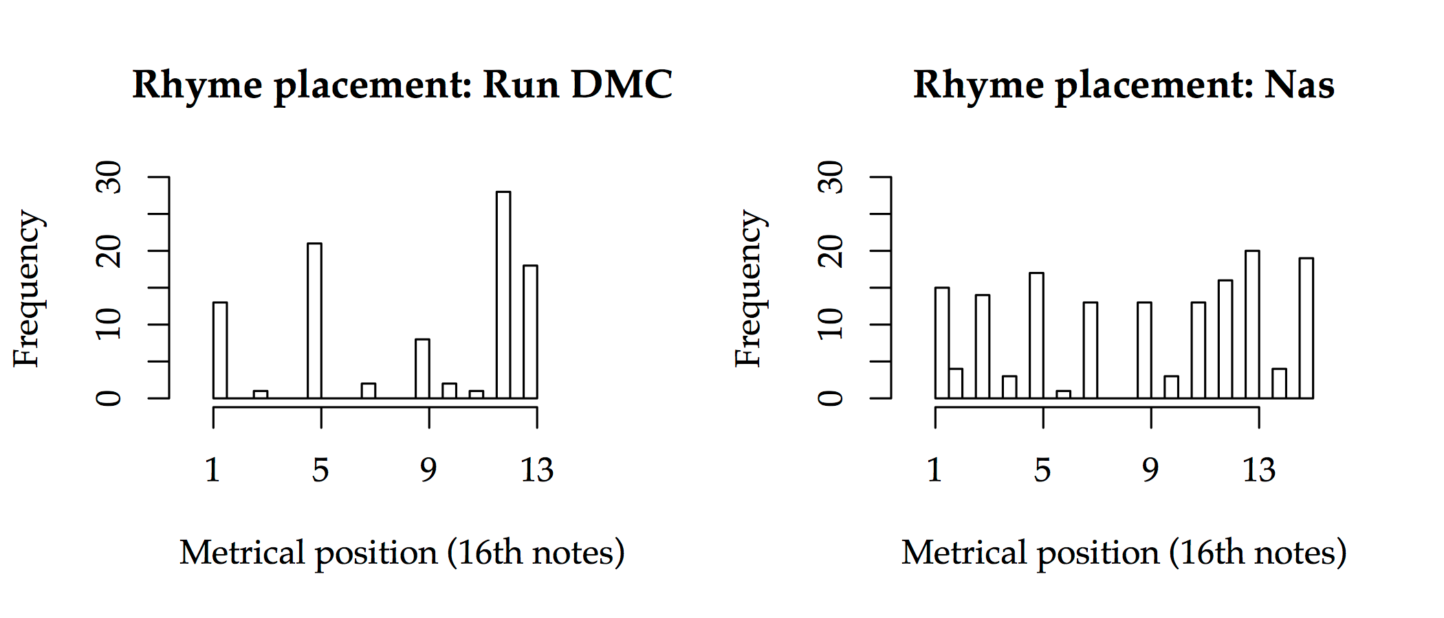 The remaining metrics are shown in Table 1. The Nas song from 1994 has more multisyllabic rhyme domains, a smaller proportion of group-final rhyme correspondents, and less metrical parallelism between successive rhyme schemes than the Run DMC song from 1986.