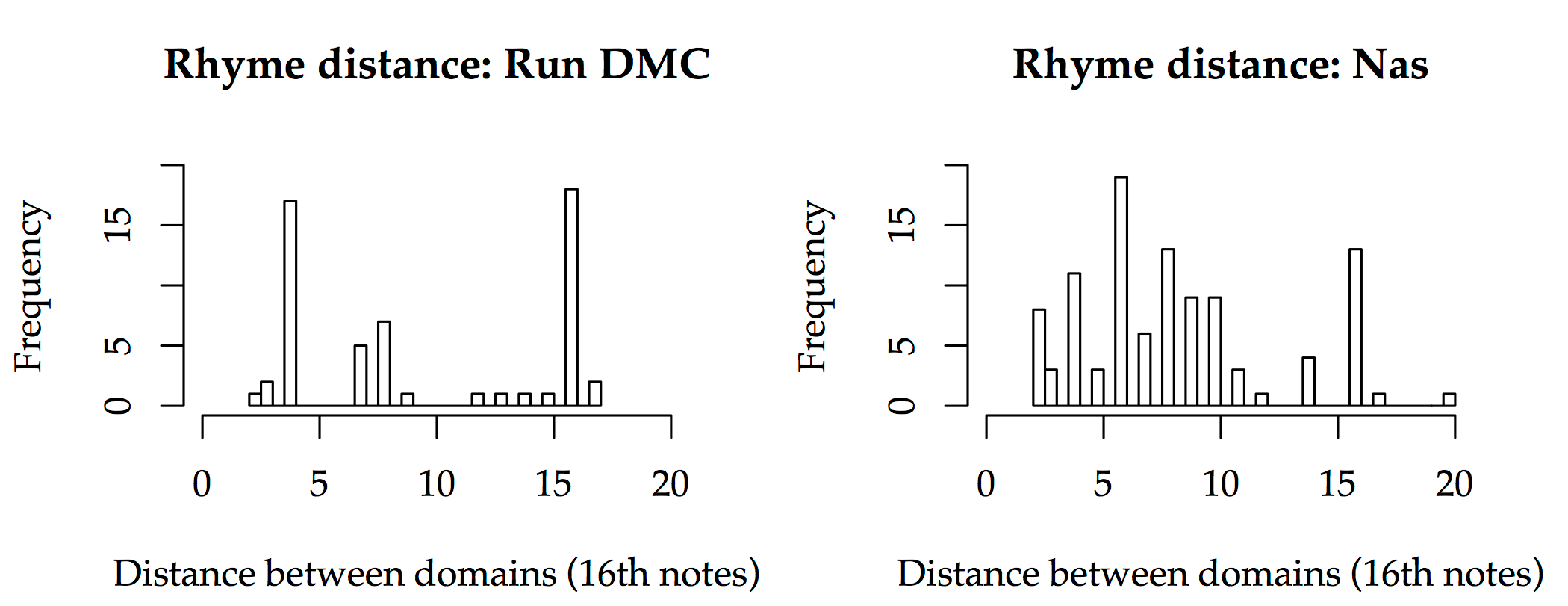 I conducted the same analysis for the distance between rhyming pairs. The Gini coefficient for 'Peter Piper' is 0.63; for 'The World is Yours', it is 0.45. Histograms are shown in Figure 2. This confirms that the metrical distance between domains in a rhyme relation is more variable (in the specific sense of being more evenly spread across values) in the later song than the earlier one. In particular, the vast majority of distances in 'Peter Piper' are 4, 7, 8, or 16 16th notes, while 'The World is Yours' displays more variety.