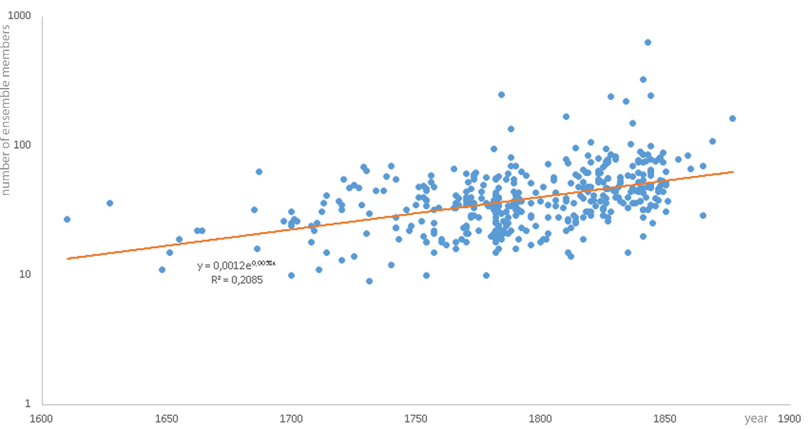 When looking at the total number of parts specified in orchestral scores and their increase in the years between 1700 and 1950 (and their stagnation in the years from 1950 to 2000) it could be enlightening to take a glance at a similar phenomenon, which can be seen in the growing number of musical instrument players in 415 European orchestra-like ensembles in the time between 1610 and 1877 (see Figure 2, calculated on the basis of ensemble members lists in Reuter, 2002, p. 523–544). One can say that not only the number of parts in orchestral scores was increasing over time, but also the number of instrumentalists playing in an orchestra:
