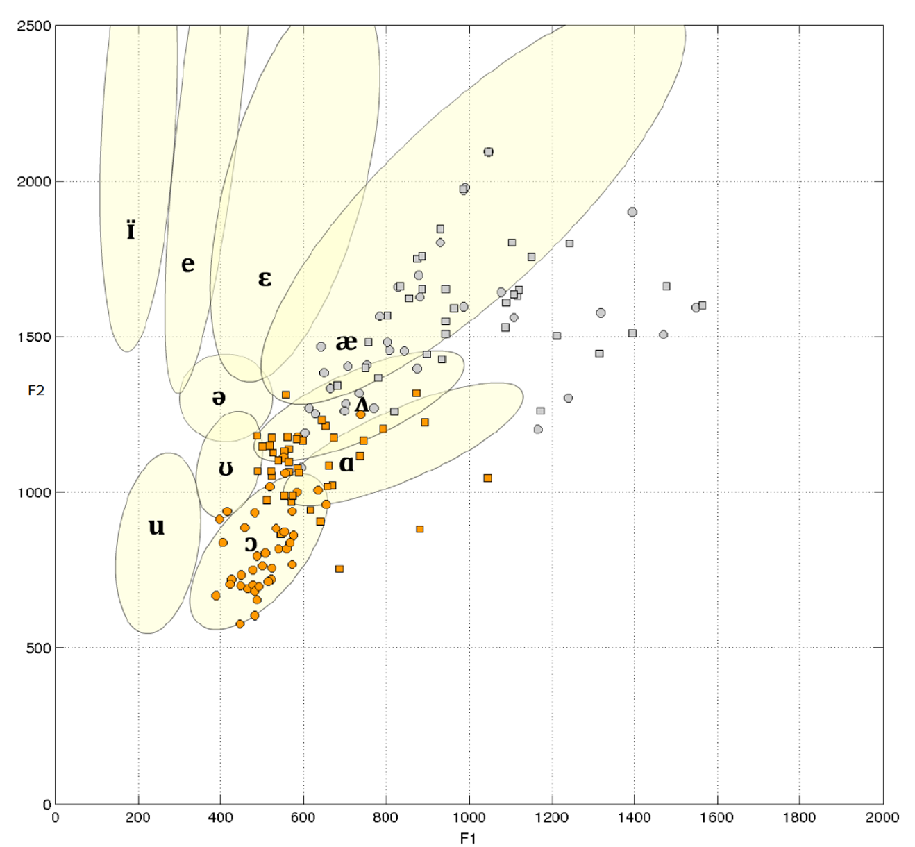 Fig. 3. First formant (F1, X axis) and second formant (F2, Y axis) of bassoon timbres (orange) and oboe timbres (grey) in all reachable pitches and in ff as well as in pp projected on vowel formant areas. From Reuter et al. (2017, p. 191).