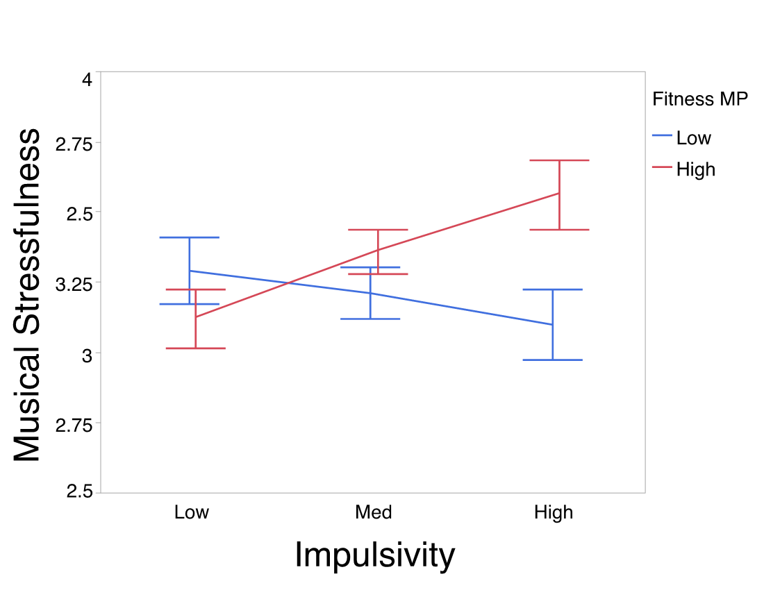 Fig. 1. Interactions between impulsivity and fitness. Among people with low and medium impulsivity ratings, the stressfulness ratings of preferred music do not differ between those low in fitness and high in fitness. Among people with high impulsivity ratings, the stressfulness ratings of preferred music are significantly different between those with low and high fitness levels: people with higher fitness preferred more stressful music than people with lower fitness. The error bars represent standard error values.