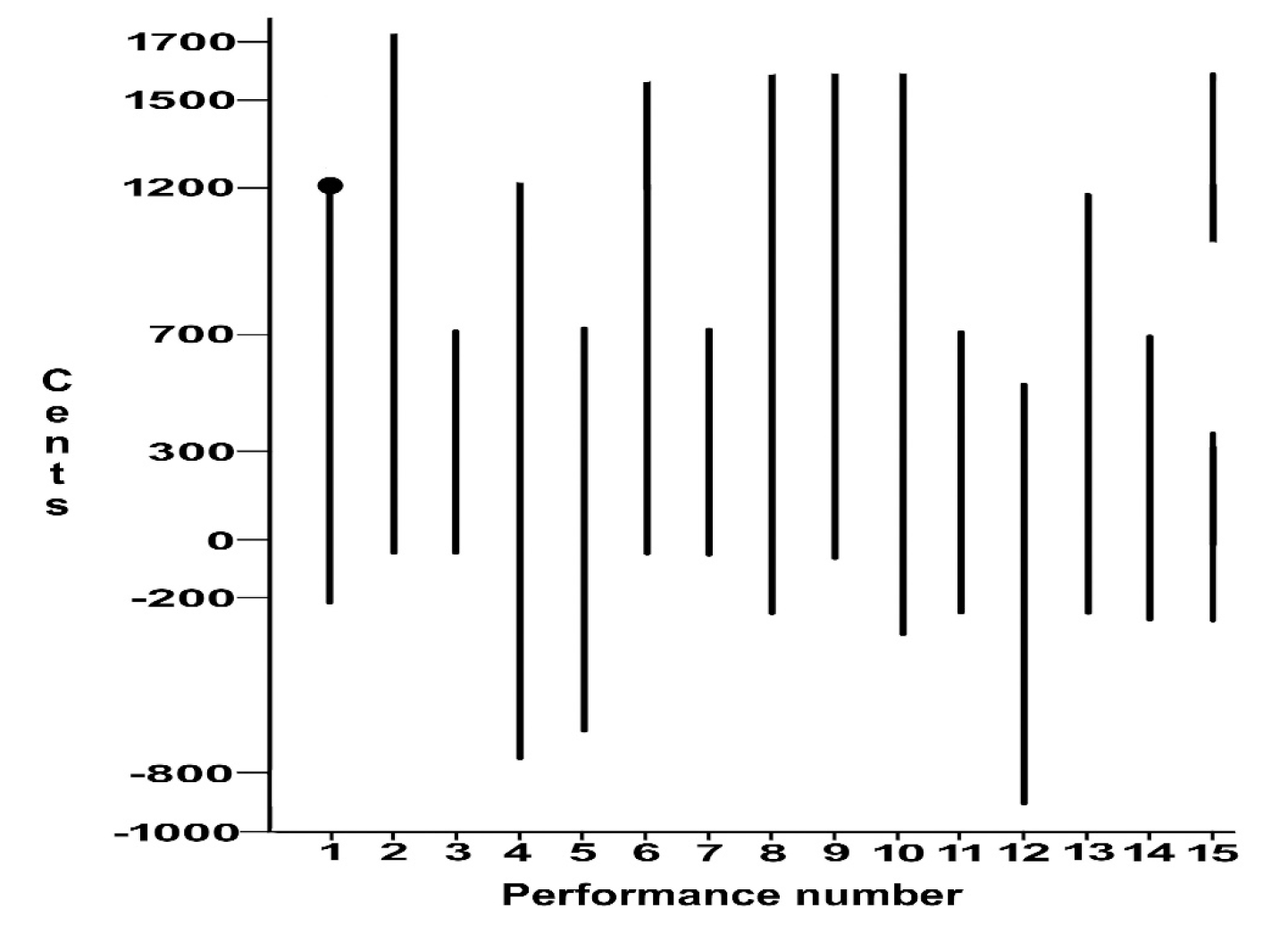 A cluster appears in the range of 964.3 to 993.1 cents (mean = 979.1). This cluster comes from performances 5, 8, 10, 13, 14, and 15, and numbers 14 notes.