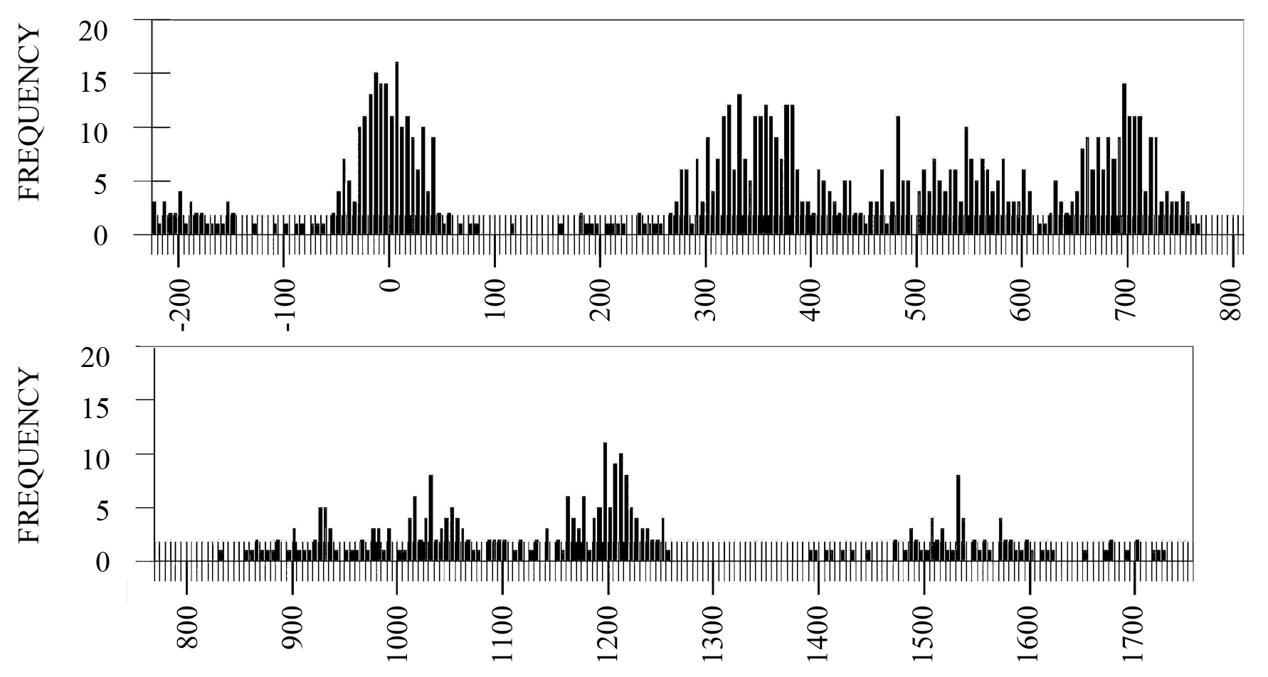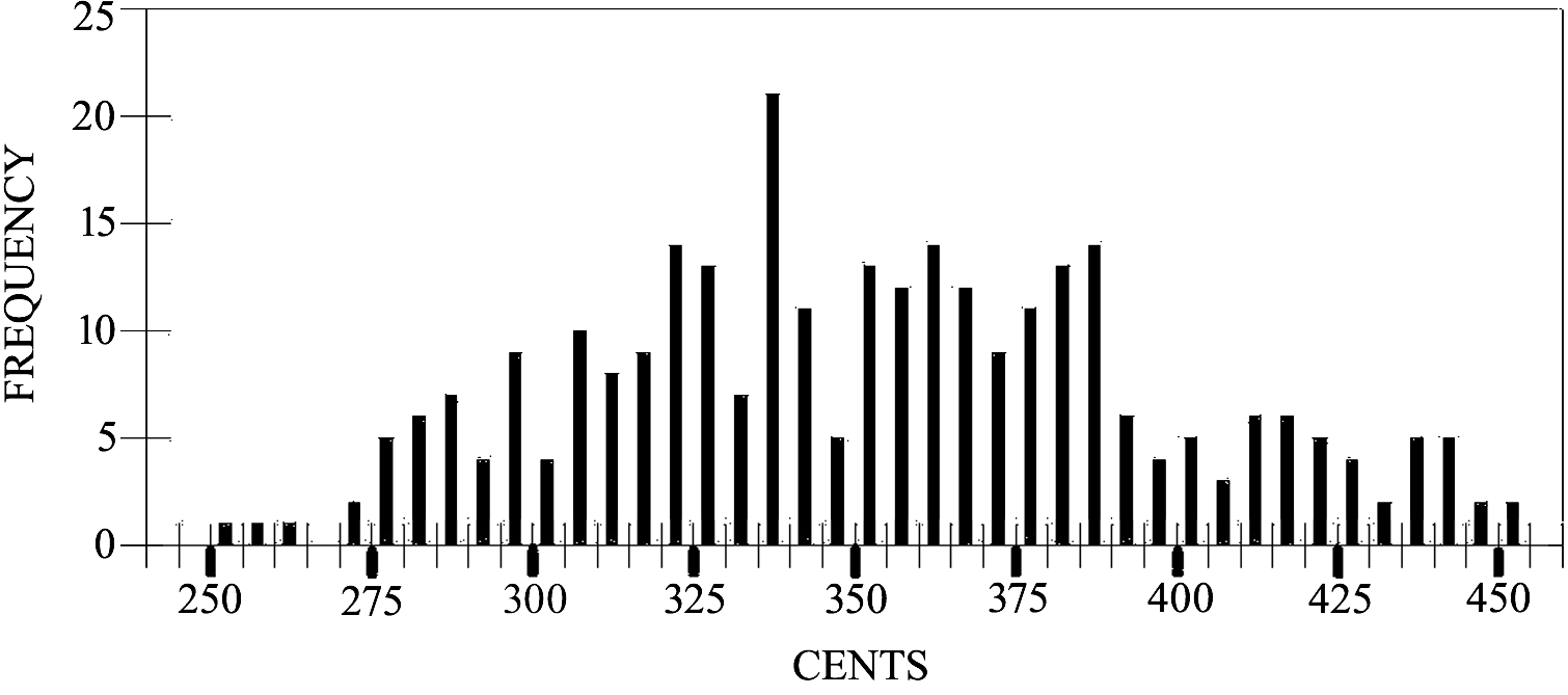 The cluster range from 267.7 to 448.0 cents was the second most commonly produced set of pitches after the tonic. Analysis of the tonic tone suggests that this range was too broad to represent a single acoustic target (cluster std. dev. = 1.69 * tonic), but instead, was likely some mixture of a minor and major third. To dissect this complex further, the minor third could be isolated in three ways. Performances 5, 12, and 15 lacked any pitches above 370 cents, and were thus deemed to lack a significant major third. Titon (1977, p. 155) noted that performances with this cluster appearing as a tenth usually lacked a major third; in this study, a cluster was identified from 1473.2 to 1559.1 cents (mean = 1518.3). A second cluster in this upper octave had a range of 1561.6 to 1602.6 cents (mean = 1582.0). Individual cluster analysis of performances 6 and 13 revealed a wide split in this cluster with only 3 and 4 major thirds respectively. These approaches produced 77 minor thirds in isolation with a mean of 319.1 cents and range of 256.8 to 359.1 cents. No isolation of the major third was possible in the lower octave as there was no performance with only a major third. A fine-grained histogram of all data compressed into a single octave within the range of the minor + major third is shown in figure 4. No obvious separation into two clusters is evident in this overall histogram. Similarly, a more fine-grained cluster analysis did not provide any simple clustering into two groups in the main octave.