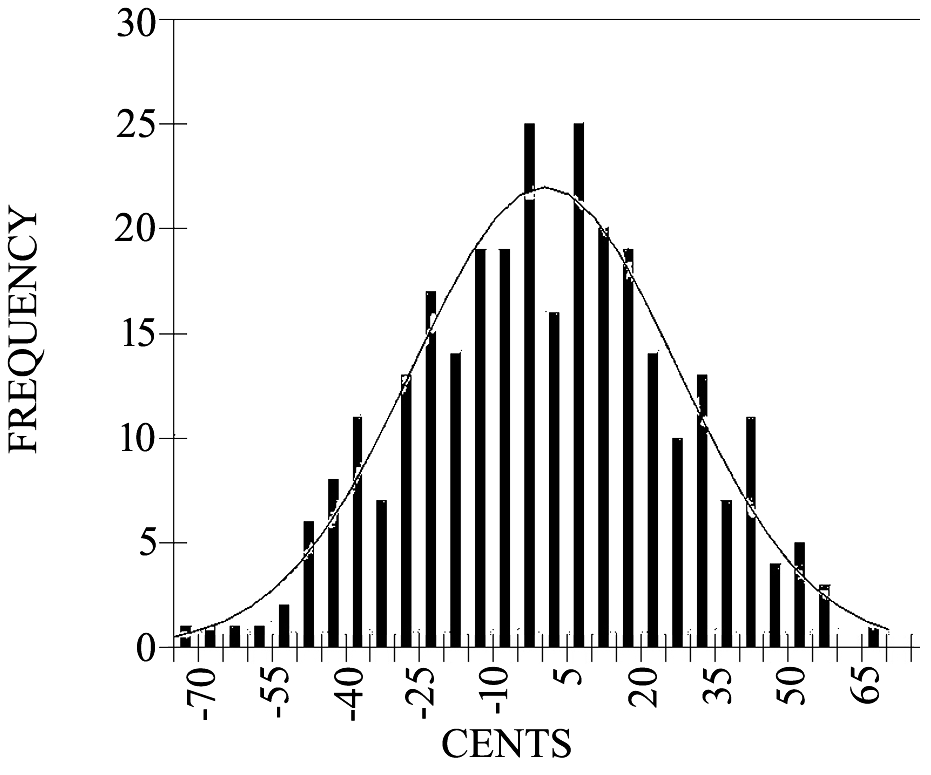 The upper and lower register tonic clusters had a similar octave adjusted range and mean pitch. Individual tonic ranges were within +/- 60 cents of the intended target and had generally the same shape as the overall histogram, except for Huddie Ledbetter, whose tonic range was -71.30 to 66.58. Vera Hall had the narrowest tonic range in performance 3 at -37.15 to 27.74, along with Skip James at -32.04 to 34.37. A histogram combining all tonic notes is shown in figure 3 along with a normal distribution with the same standard deviation and number of elements. The tonic distribution roughly conforms to the bell curve of a normal distribution. The standard deviation for the entire sample range was 27.85 cents; Ledbetter had the largest standard deviation at 38.96, and the smallest deviations (16.36, 18.20 and 18.46) were by Hall #3, James, and Patton #13.