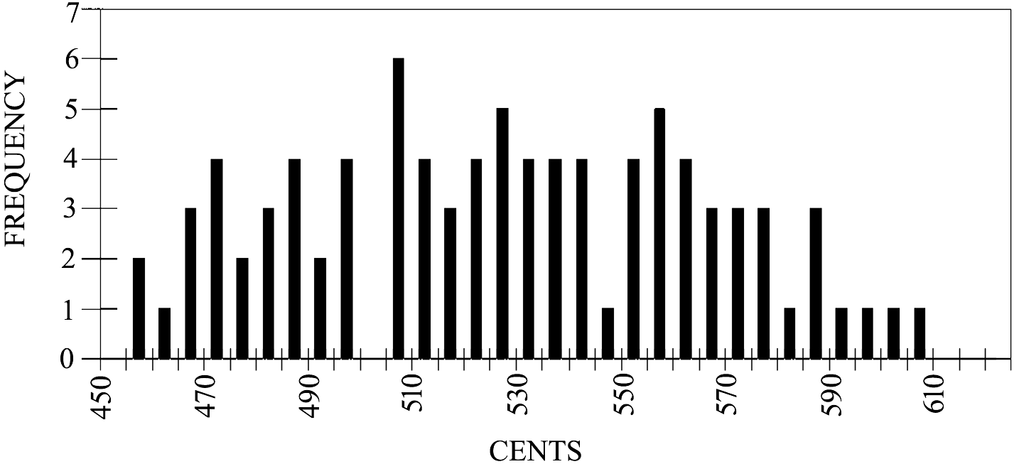 The cluster range of 618.8 to 761.6 cents (mean = 693.3) is likely the perfect fifth in isolation. The shape of this cluster in Figure 2 resembles the cluster shape of the tonic in Figure 3, except that the fifth appears to have a distribution skewed slightly toward the left.
