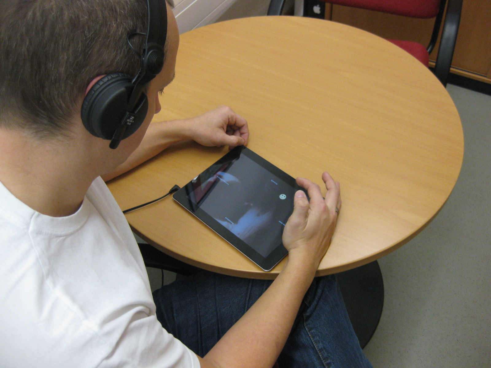 The emoTouch-application was the ideal mapping tool for this research study, because it provided videos with an additional scaling background and thus enabled a spontaneous user feedback: The participants were asked to mark their felt emotions on a tablet's touchscreen while watching a video on the same screen and listening simultaneously to the audio variables (music and sound effects) via headphones (see Figure 1). After each test run, the resulting x-/y-data stream could be easily evaluated with statistical software.
