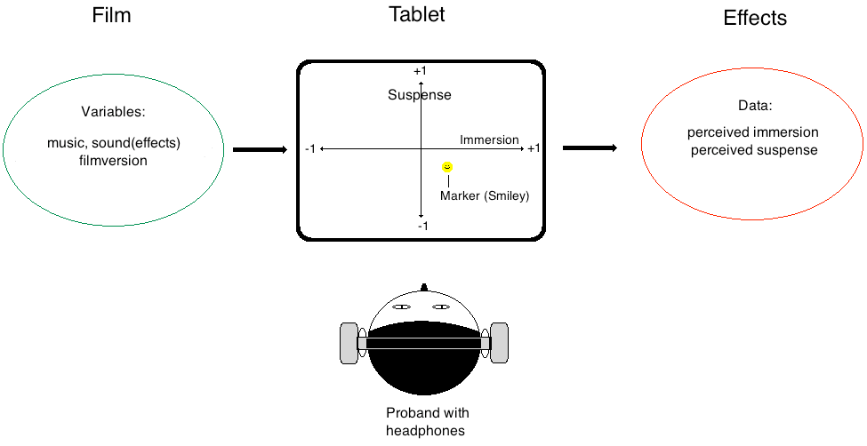 This study implemented therefore an experimental design, which corresponded to the participant's everyday situation: watching a professionally produced television event or movie on a tablet screen with headphones in a relaxing surrounding. Bullerjahn stated that this experimental design could result in more sensible outcomes (Bullerjahn, 2008) than other test designs. Tracking of eye-movements (Auer et al., 2012), measurement of heart rates/ skin conductance or fMRI-methods (functional magnetic resonance imaging) imaging the participant's brain activity might generate less valid results caused by potentially exerting stress to the participants during their testing procedure (Donnelly, 2015; Eklund, Nichols, Knutsson, 2016). In addition, compared to other research tools like EMuJoy (Nagel et al., 2007), the emoTouch-application (Scholle & Louven, 2013, 2015) does not need technical interfaces like a mouse or joystick and allows the participant's nearly simultaneous and direct reaction to be measured. Therefore, the emoTouch-application was employed as a mapping tool in this study (see the next 'Method' section).