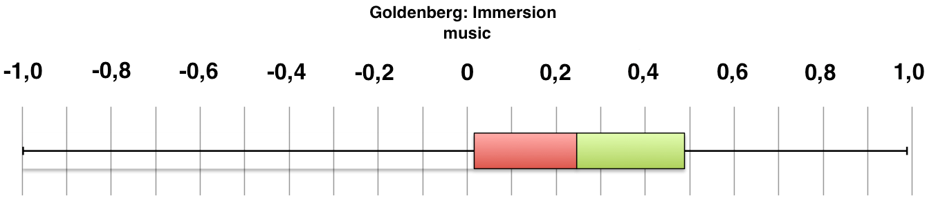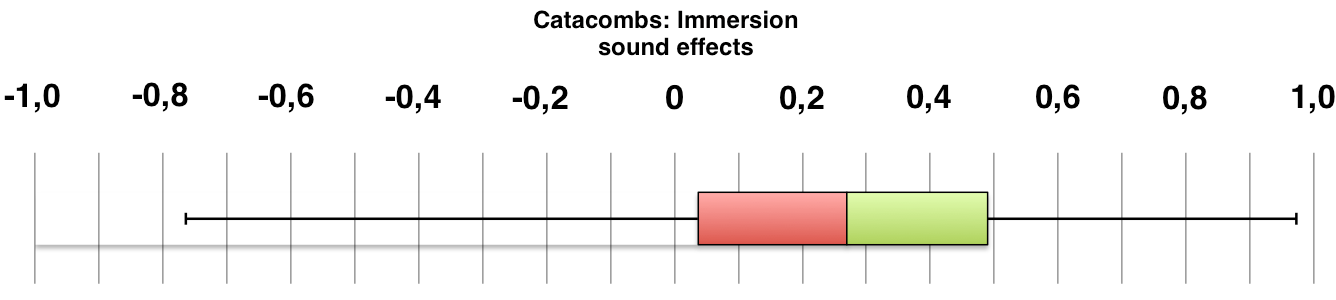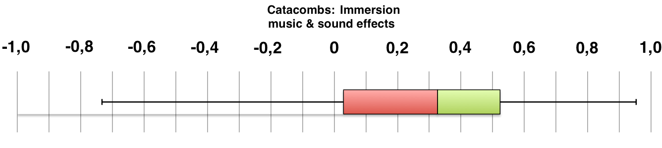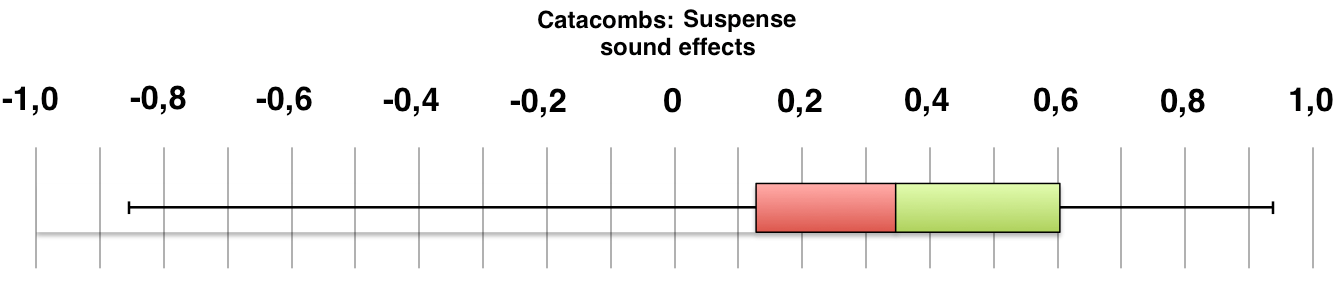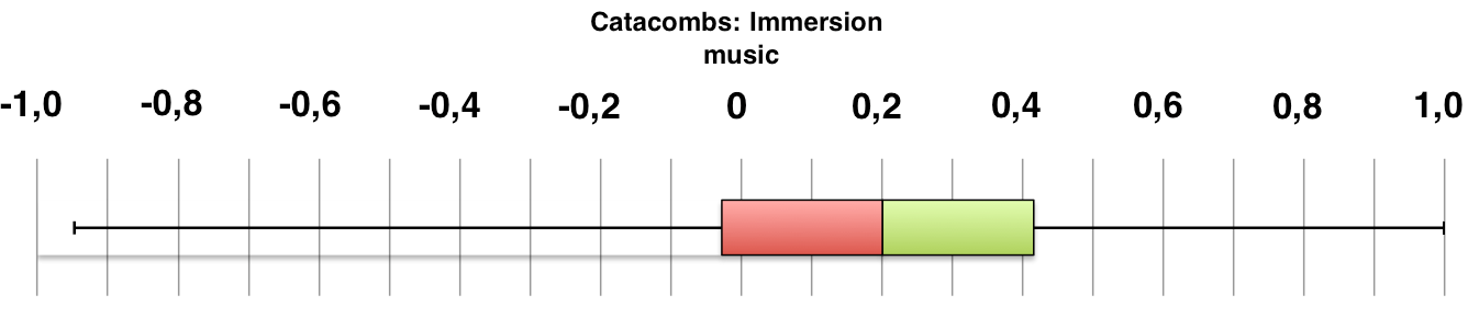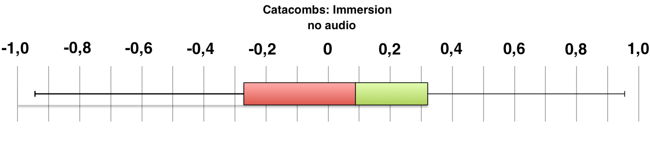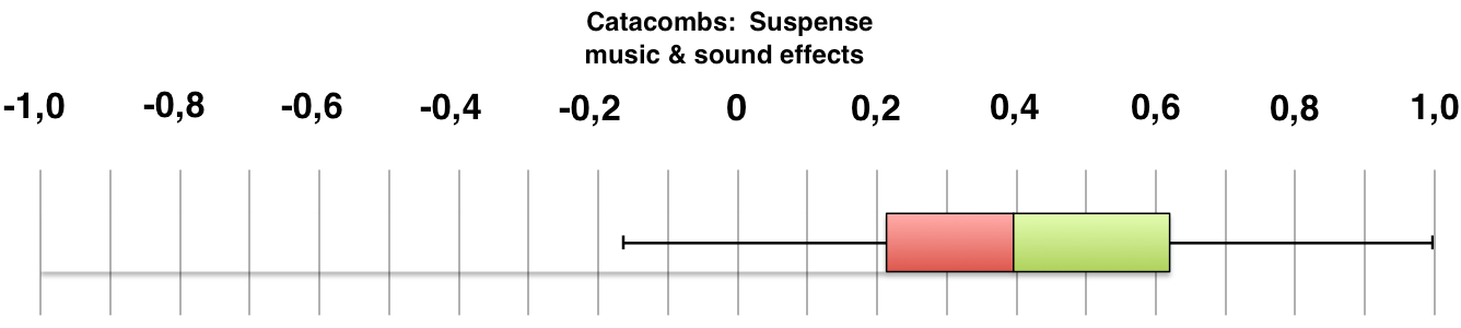 Apparently, the immersive power of music alone and its induced suspense, triggered by audio, seems to be overestimated (see also 'Stimuli and Procedure'). These are the principal findings displayed in Figure 6 (immersion) and Figure 8 (suspense) regarding the live-action movie 'Catacombs'. An explanation could be that the participants might have perceived incongruence between their visual and musical perception channels (see Cohen's Congruence-Association-Model CAM, Cohen et al., 2006). This incongruent sensation led perhaps to a lower emotional effect (Boltz, 2004).