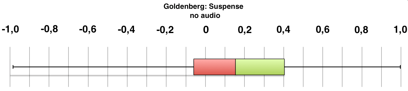 Fig. 3. Boxplots of the participant ratings for the animated movie 'Goldenberg'. The vertical black line between the green and red boxes indicates the median. The left side of the red box depicts the 25%-quartile, the right side of the green box depicts the 75%-quartile. The whiskers left and right represent the minimum or the maximum of the participant ratings.