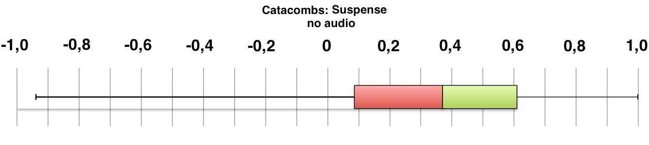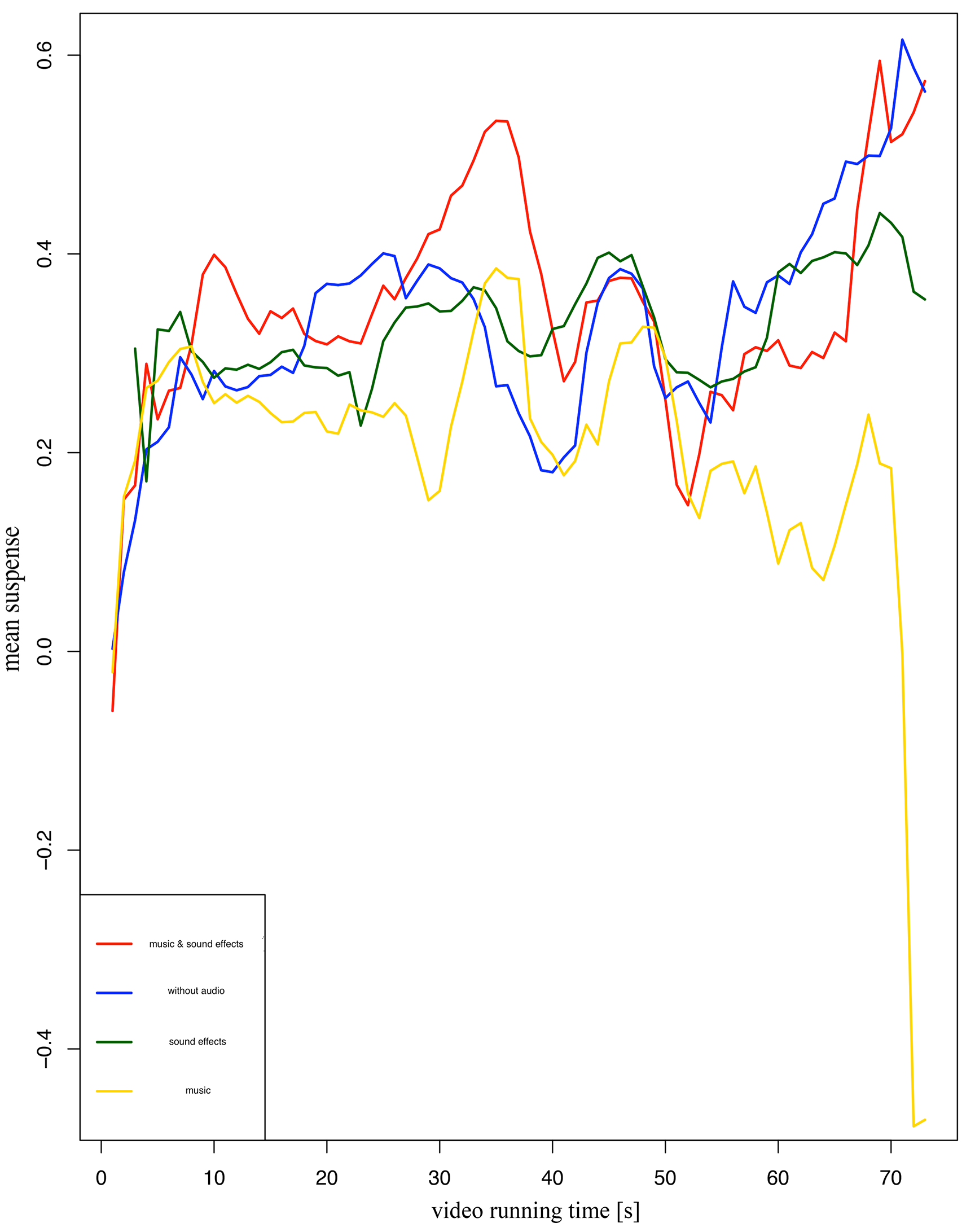 The mean suspense values of the live action movie 'Catacombs' (Figure 8) illustrate that the yellow line (music) has the lowest level of perceived suspense on average, whereas the blue line (no audio) depicts nearly always higher suspense values. Sometimes these values are even higher than in the version with sound effects and the full audio version with sound design. This is noticeable especially towards the end of the video because there is a 'cliffhanger' in the plot (see Appendix).