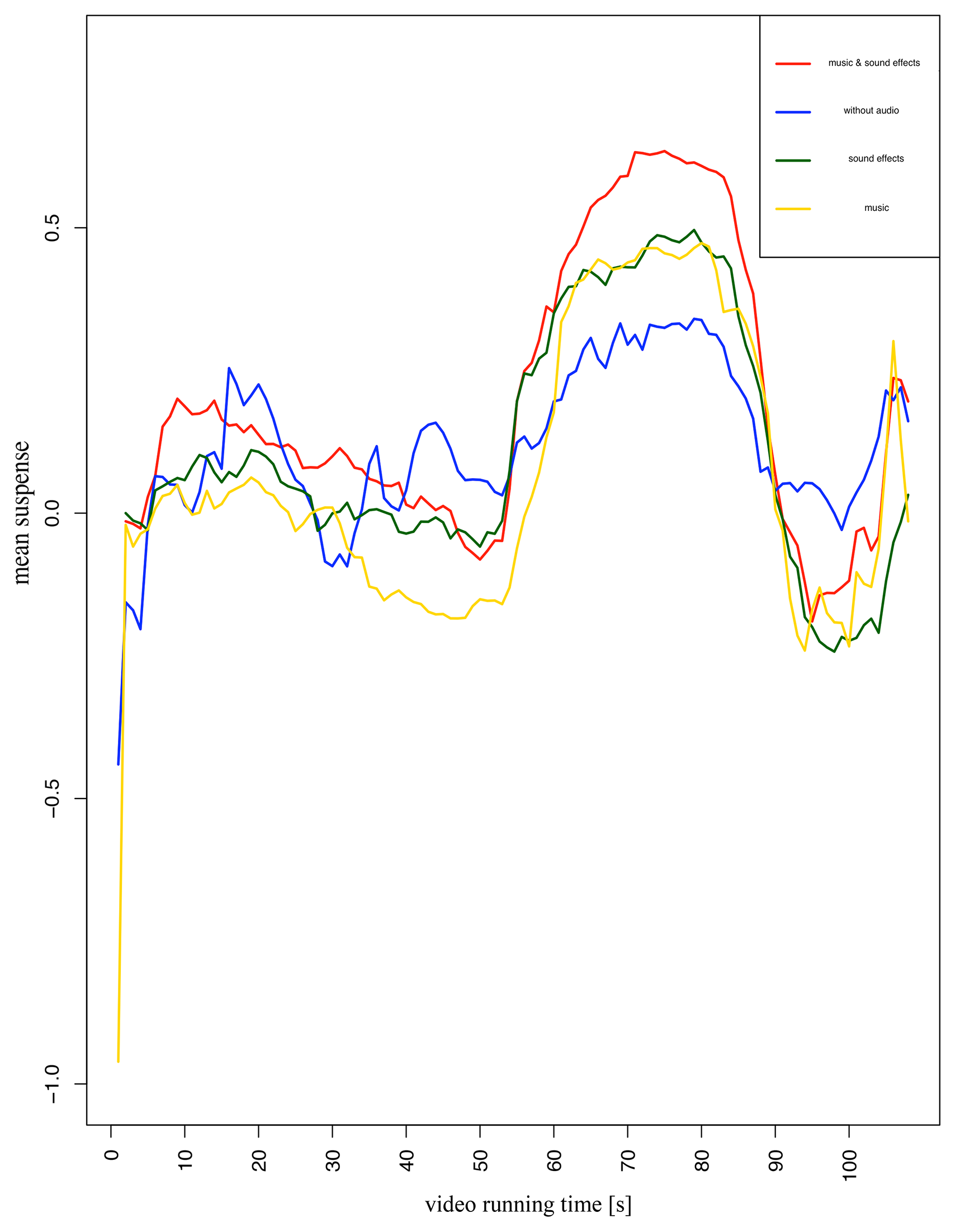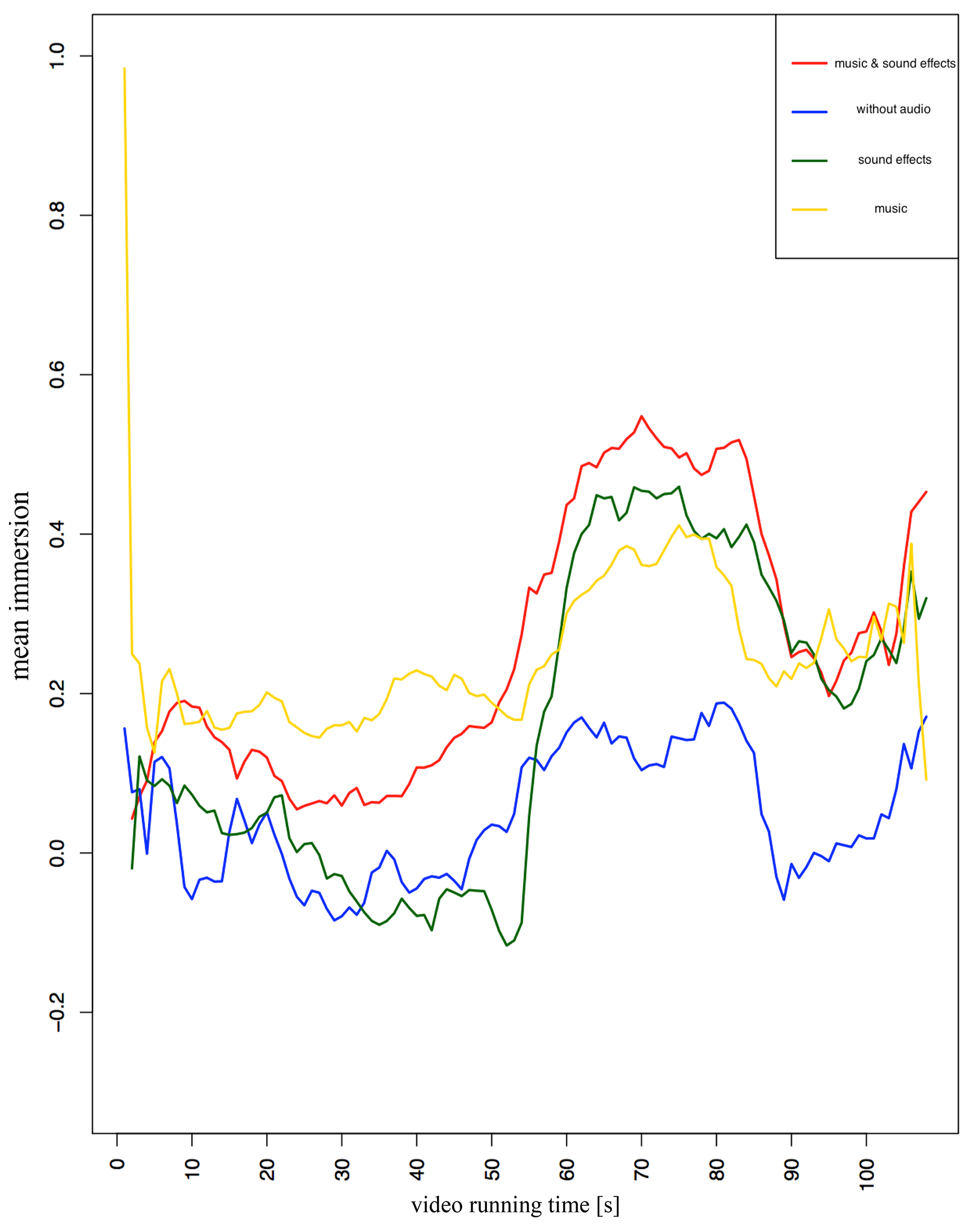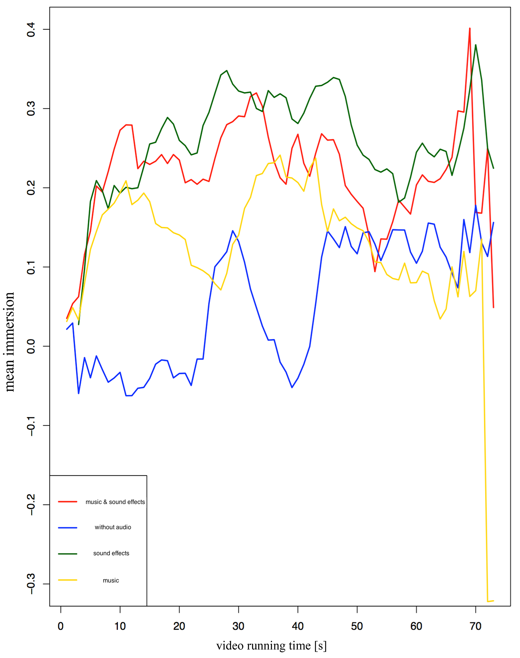 The mean immersion values of the animated film (Figure 5) indicate a higher average immersion when the participants listened to the audio versions, especially when the film plot is displaying visual action (i.e. at 55s running time). The blue line representing the silent version shows lower values. The red (music and sound effects) and the green (sound effects) lines indicate much more dynamic immersion ratings than the yellow (music) and the blue (without audio) lines. In general, music (yellow line) seems to balance the induced immersion, with a dynamic range smaller than the other conditions.