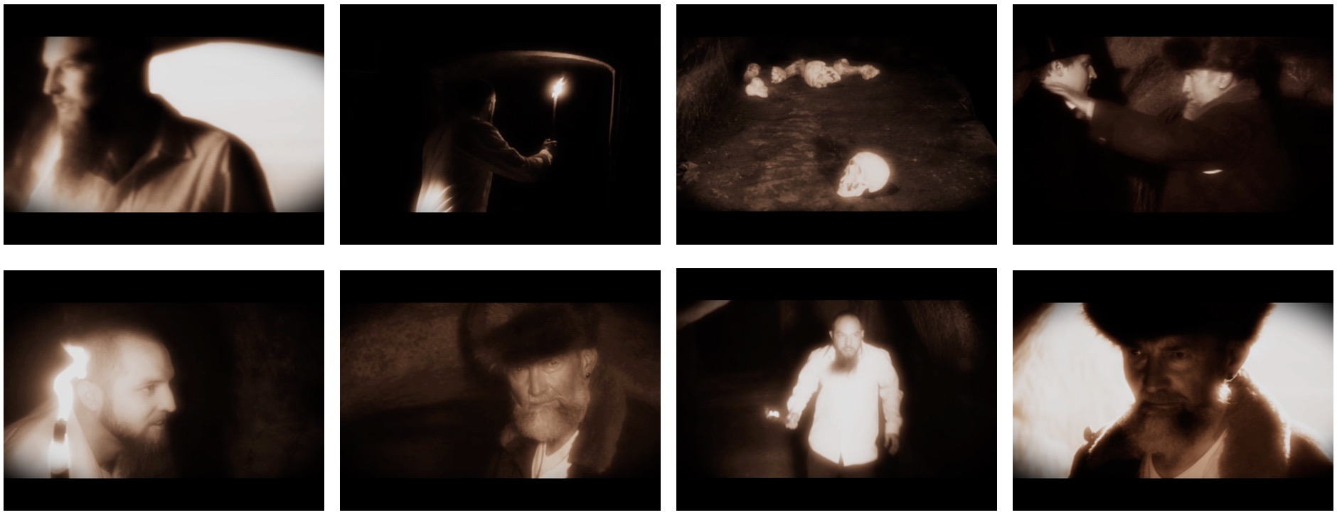 The live-action movie 'The Catacombs' is staged with actors in subterranean hallways. These are re-presenting the catacombs of Paris. In Mussorgsky's programmatic piano composition the catacombs are musically figured as droning and gloomy bass chords; they are played very slowly. The stimulus video enacts a new film plot, taking place in these Parisian hallways: a man accidentally observes a murder.
