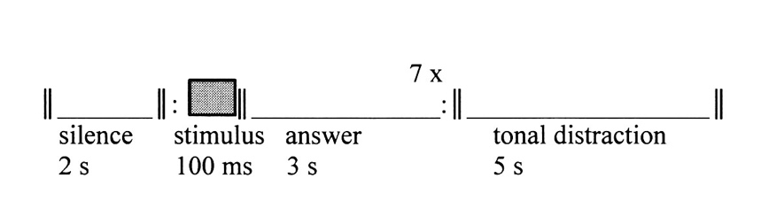 All listening tests were given as group sessions in a quiet seminar room of the Music Academy. 3 Participants sat at tables with paper and pencil and listened to the test items through reference monitoring headphones (Beyerdynamic DT 770 Pro). After a general introduction to the procedure, three practice items confirmed the understanding of the test sequence. During the task, the test items were administered in blocks of seven items, followed by a brief musical example that was distorted by glissandi between different tonalities; this was to distract attention and confuse any tonal orientation. The participants were asked to fill the letter name (only chroma, one out of 12, without accounting for enharmonic changes) onto an answer sheet as quickly as possible (Figure 1).