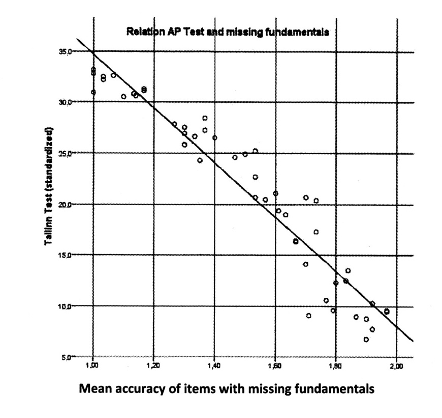 Fig. 2: Significant linear correlation of TTAP with the means of items with missing fundamentals; the higher the TTAP score, the better and more accurate a response (i.e. closer to 1, indicating a correct hit).