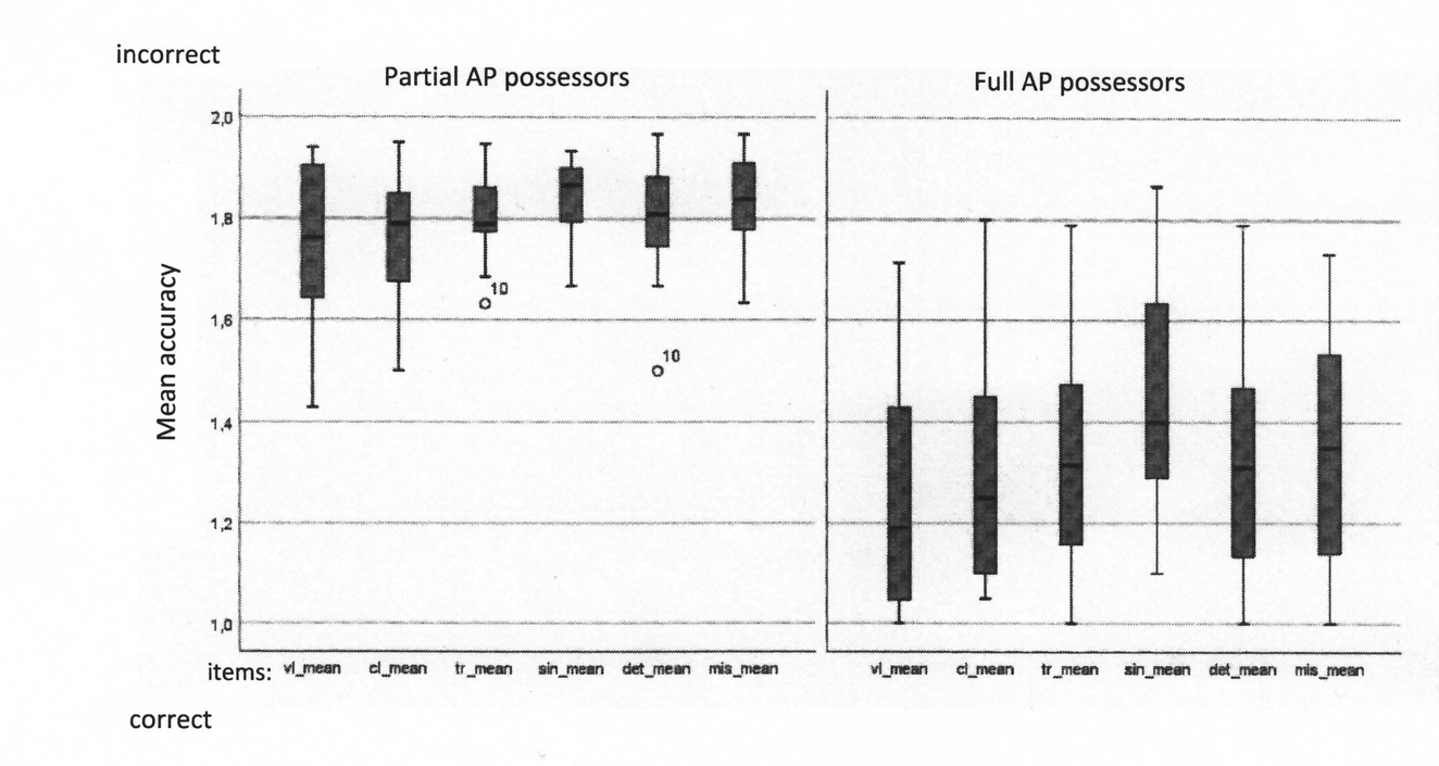 A comparison of the two types of AP possessors (full and partial) displays a clear differentiation between the mean scores of full AP possessors and those with partial AP (Figure 3). They score significantly lower than full AP possessors (p < .05), who responded with more correct answers. This indicates a stronger impact of psycho-acoustic parameters on the decrease of pitch recognition accuracy for partial AP possessors.