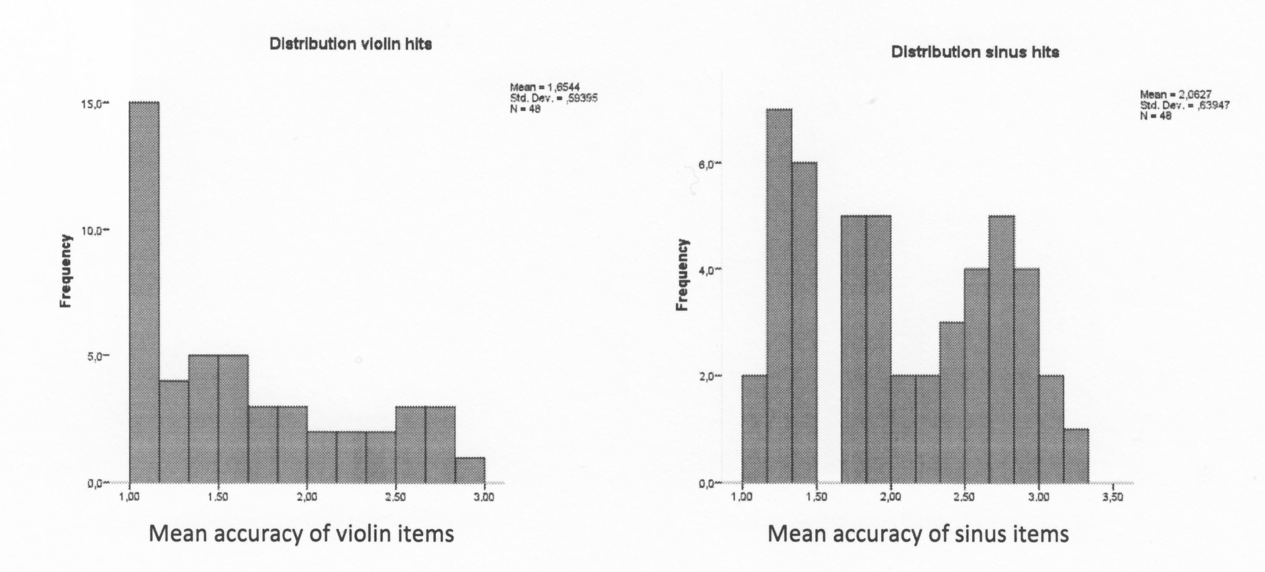 The hit rate also differed significantly between instrumental items and acoustically manipulated items. In general, pure tones were recognized less accurately. Figure 4 shows the differentiation between violin tones and pure tones (p = .003); whereas violin tones result in the most correct hits, pure tones demonstrate a skewed distribution of answers, with higher frequencies of incorrect answers.