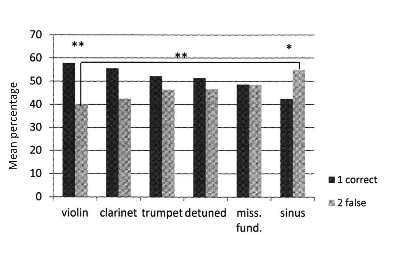 Fig. 5: The mean percentage of correct and false recognitions reveals a decrease of correct hits and, in contrast, an increase of false answers with the highest percentage in pure sine tones. The difference between errors for violin and sine tones is highly significant (significance levels: * < .05; ** < .01).