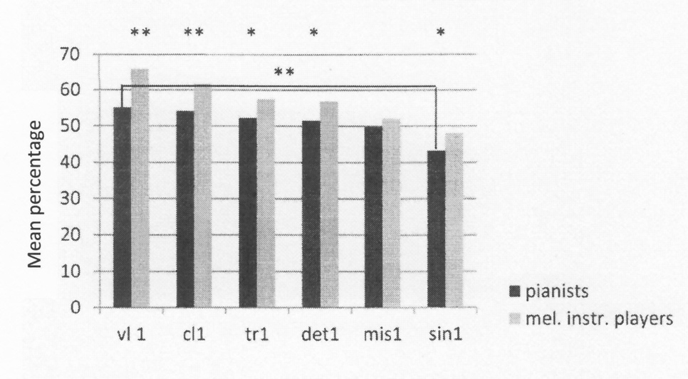 Fig. 6: Percentage of correct hits for pianists vs melodic instrument players for all items (violin, clarinet, trumpet, detuned, missing fundamental, pure sine tone) with significance levels (* < .05; ** < .01).