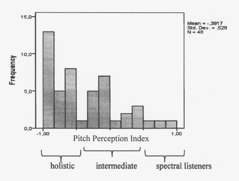 The Pitch Perception Preference Test (Schneider & Bleeck, 2005; Schneider et al., 2005b) enlightens characteristic modes of pitch processing, depending on the focus on fundamentals (holistic listeners) or the overtone spectrum (spectral listeners). Data from an extended data-pool demonstrate that AP musicians have either a strong holistic or a pronounced spectral pitch perception, whereas a balanced or intermediate perception mode appears less frequently. Therefore, no specific dominance can be assigned to AP possessors. This might explain why individual perception indices from Schneider's PPPT do not show any significant effect on AP scores. Even regarding the items with missing fundamentals (which spectral listeners usually perceive weaker compared to the spectral pitches arising from harmonics), both types are not differentiated by their recognition scores in the respective TTAP section in terms of their means. However, two thirds of pure spectral listeners had difficulties recognizing items with missing fundamentals, confirming previous research findings regarding the inability to perceive missing fundamentals (Schneider & Wengenroth, 2009).