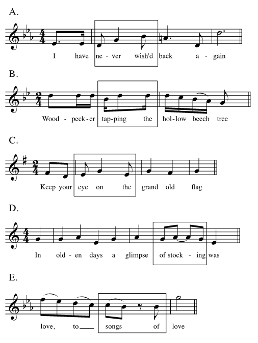 Fig. 1. (A) Dora Greenwell and Jacques Blumenthal, "Answers," mm. 25-6, in Songs of Scotland, 87; (B) Thomas Moore and Michael Kelly, "The Woodpecker," mm. 17-18, in Songs of England, 173; (C) George M. Cohan, "You're A Grand Old Flag," mm. 82–5; (D) Cole Porter, "Anything Goes," mm. 21-2; (E) Thomas Morton and Henry Bishop, "Pretty Mocking Bird," mm. 28-9, in Songs of England, 63.