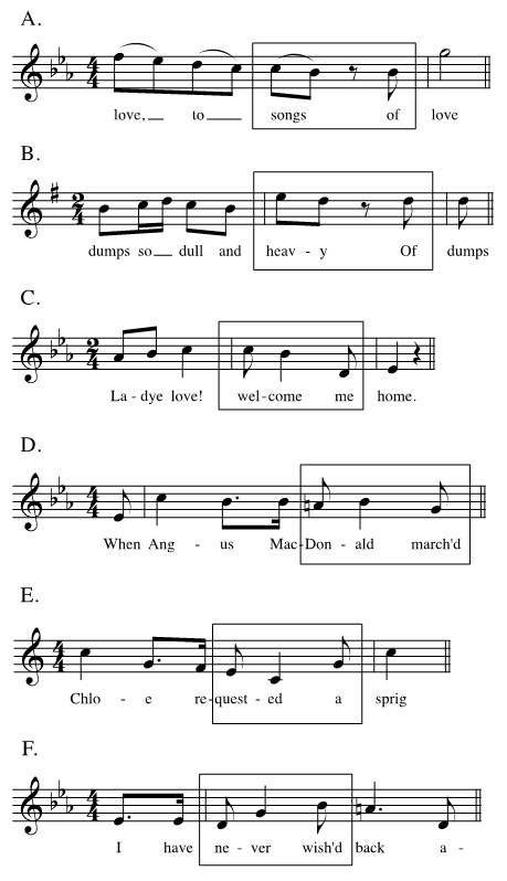 The six passages in Figure 2, all from 19th-century English and Scottish songs, illustrate this point in more detail. The boxed segments in the six examples are virtually identical in their pattern of note onsets, in relation to the meter. (The only difference is that some begin at the beginning of a 4/4 measure, some at the midpoint, and some at the beginning of a 2/4 measure; I do not consider these distinctions further here.) Figures 2A and 2F were presented earlier (Figures 1E and 1A). I have already suggested that Figure 2F feels much more syncopated than Figure 2A; the question is why. Clearly, the reason is the differing levels of accentuation of the second note in the segment (hereafter just the "second note"). At least four factors contribute to this: