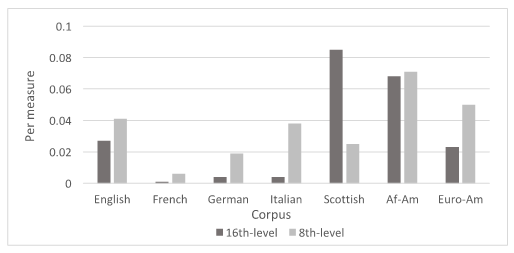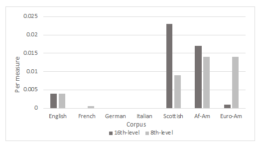 We first consider 16th-note syncopations. The first column of numbers in Table 2 shows the number of onset syncopations in each corpus, followed (in parentheses) by the number per measure. The per-measure numbers are more meaningful than the sheer counts, since the corpora vary in size. The second column shows the number of songs in each corpus containing at least one onset syncopation, shown also as percentages of the total. 10 For the European nations, the results resemble those found in Temperley and Temperley's (2011) Scotch snap study: 16th-level second-position onset syncopations are far more common in the English and Scottish corpora than in the three continental corpora. 11 The third and fourth columns show the same figures for acute syncopations. Acute 16th-level syncopations are non-existent in the three continental corpora, but there are a handful in the English corpus and a larger number in the Scottish corpus. The African-American corpus has a relatively high incidence of both onset and acute syncopations, similar to the Scottish corpus in both cases; the Euro-American corpus features a similar incidence of onset syncopations to the English corpus, but hardly any acute syncopations.