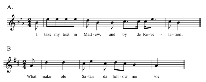 Fig. 7. (A) "There's a Meeting Here Tonight," mm. 1-4, in Slave Songs of the United States, 9; (B) "Hold the Light," mm. 1-4, in Slave Songs of the United States, 10.