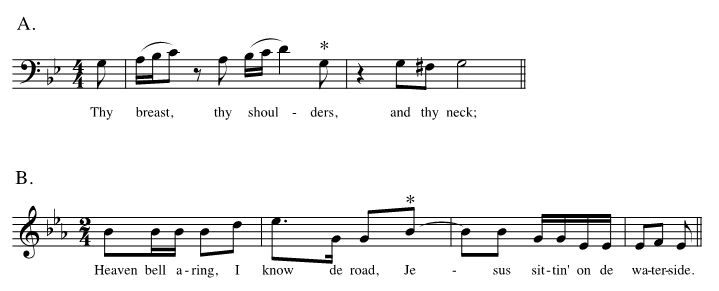 It is instructive to consider the incidence of fourth-position syncopations in the songbooks used in the previous corpus analysis. Regarding the European corpora (including the English and Scottish ones), there is not a single clear example of an anticipatory fourth-position syncopation in any of the five repertoires. Even defined in terms of onset pattern—an onset on the fourth quarter of a quarter-note or half-note unit (or the last 8th-note of a dotted-half-note unit in the case of 3/4), with no note on the following strong beat—fourth-positions are extremely few in number. And in those instances that do occur, the syncopated note invariably carries an unstressed syllable or a melisma. Figure 8A shows one instance. The second syllable of "shoul-ders" could be described as a fourth-position onset syncopation; but since it is unstressed, it is quite different in effect from the syncopation shown in Figure 1D. Perhaps more surprisingly, fourth-position syncopations are extremely rare in the Euro-American and African-American corpora as well. The Euro-American corpus contains no clear-cut examples; the African-American corpus contains just one, shown in Figure 8B. This has some resemblance to 20th-century fourth-position syncopation, with a stressed syllable ("Je-") on the fourth 8th-note beat of a half-note span; but the syncopation occurs at the beginning of a phrase, which is unusual. I also examined two other late-19th-century books of African-American songs in an informal way (Fenner, 1886; Jubilee Songs, 1872), and both present the same general picture as Slave Songs of the United States: second-position syncopations are abundant, while fourth-position syncopations are virtually non-existent.
