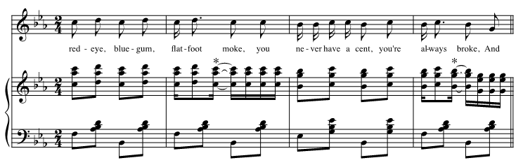 In short, none of the song corpora examined here—European, Euro-American, or African-American—show clear evidence of the type of fourth-position syncopation typical of 20th-century popular music. When and how did this type of syncopation originate? I intend to explore this question in a future study. Very briefly, fourth-position syncopation appears to have emerged only in African-American music of the very late 19th-century—ragtime and its immediate predecessors. Berlin (1980) shows that fourth-position ("tied") syncopations exploded in popularity in ragtime after 1900, but that occasional instances occurred before the turn of the century (see also Koops, Volk, & Bas De Haas, 2015). Some of the earliest examples are in piano accompaniments to songs; Figure 9 shows one from 1897 (I apologize for the racist character of this example). The right hand of the piano part is clearly following the vocal part; both the vocal and the piano part contain second-position syncopations, but only the piano part has fourth-position syncopations. This brings out the anticipatory character of the fourth-position syncopations: each one is understood to belong with the stressed syllable on the following beat ("moke," "broke"). Notated fourth-position syncopations became common in vocal parts a few years later. Thus, while second-position syncopations were pervasive in ragtime right from the beginning, fourth-position syncopations were only introduced gradually: first in piano parts, later in vocal parts. The situation is further complicated by the fact that fourth-position syncopations sometimes seem to have been used in performance before they were notated; again, I will address this issue further in future work.