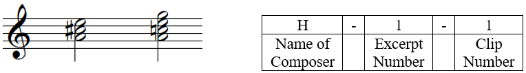 Set in the form of an online survey, the study firstly required participants to answer a series of general questions, adapted from the Ollen Musical Sophistication Index (OMSI) such as age, gender, country of origin and residence, musical expertise. The first part of the experiment then consists of a practice trial for the participants to familiarize with the format. This comprises 3 sound clips that do not reoccur in the study, and participants are asked to assess how tense the second sound is: using a 5-point scale, ranging from 1 (weak) to 5 (strong). No answer or feedback was given. In the second part of the experiment, each participant was instructed to firstly, listen to the musical excerpt (comprising a longer series of PCns); and secondly, in a randomized order, participants are to listen to a musical clip drawn from the excerpt – two sets of "sounds" or for a better term, PCns – and rate the tension of the second sound. Figure 2 illustrates an example, the first clip from Hindemith, and a brief explanation of the clip labels. This is repeated for every musical clip within the musical excerpt and the entire process is repeated for all nine musical excerpts (three excerpts each from Hindemith, Ravel, and Stravinsky). For each participant, the presentation of the musical clips within the larger musical extracts are presented in a randomized order. Participants are allowed to replay the extract if necessary. The experiment took 15 to 20 minutes to complete.