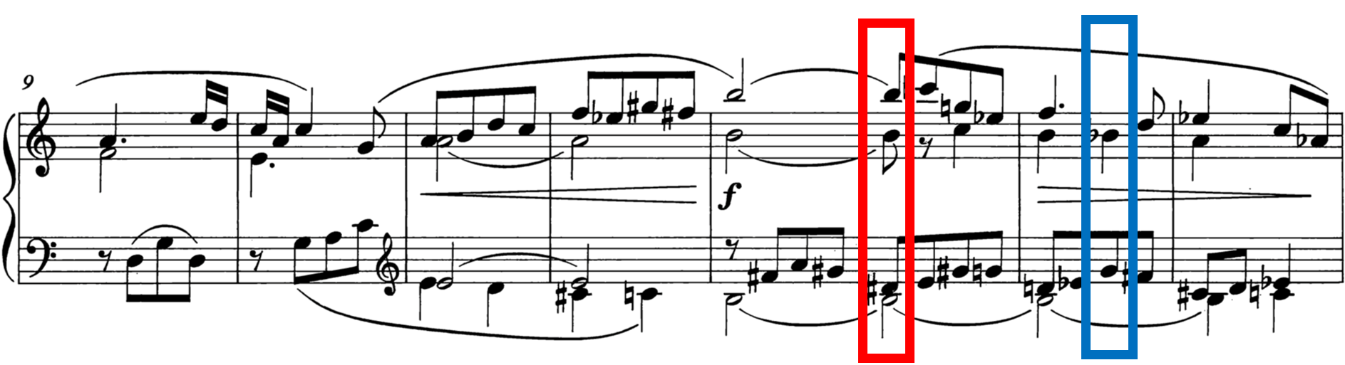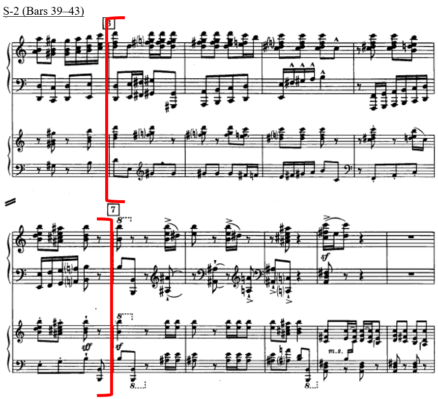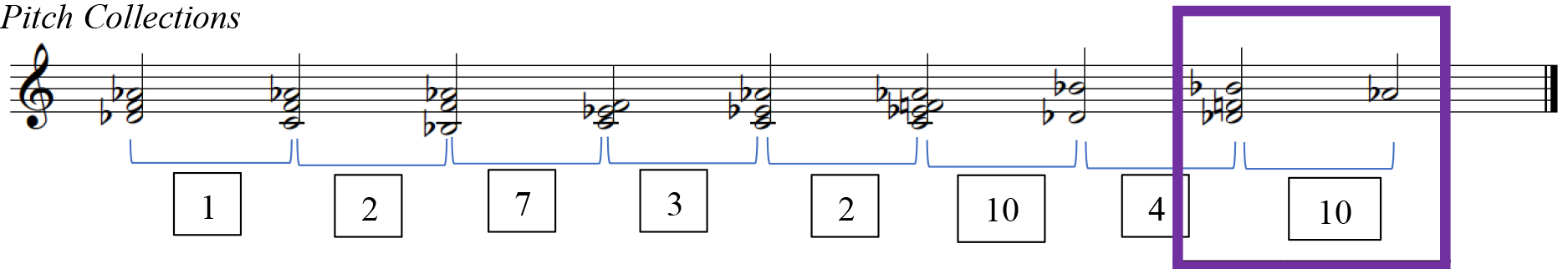Additionally, it can be pointed out that S-2-9 contains an MTR of 1.7, correlating with the model tension, AVL2. When relating this back to the music, this PCn occurs at the end of the phrase, there are fewer notes in the second PCn and it can be described as more "consonant" as well.