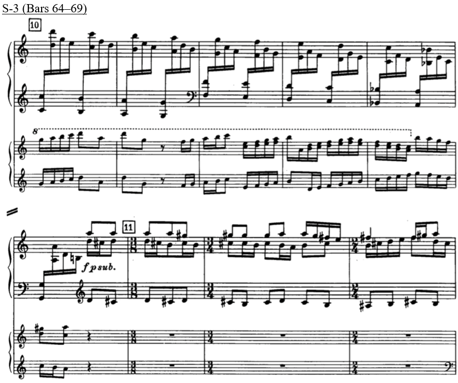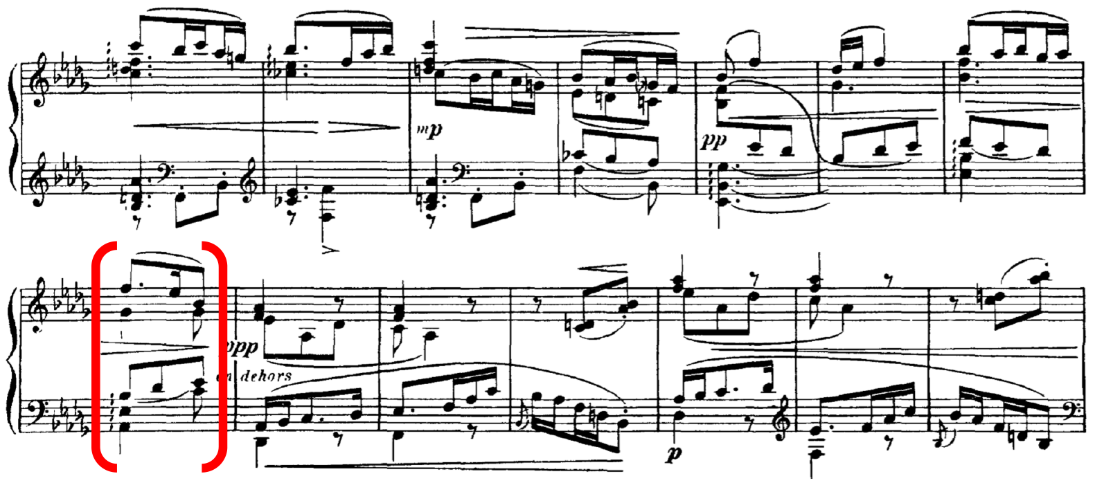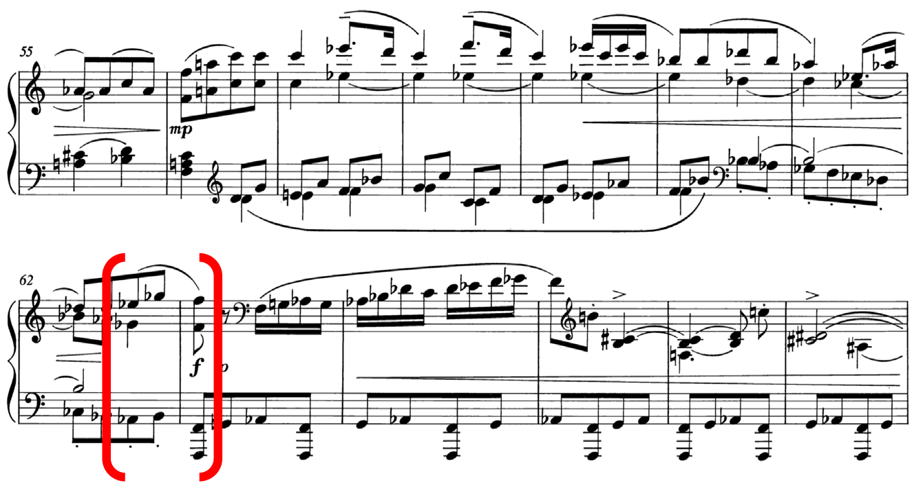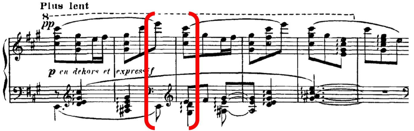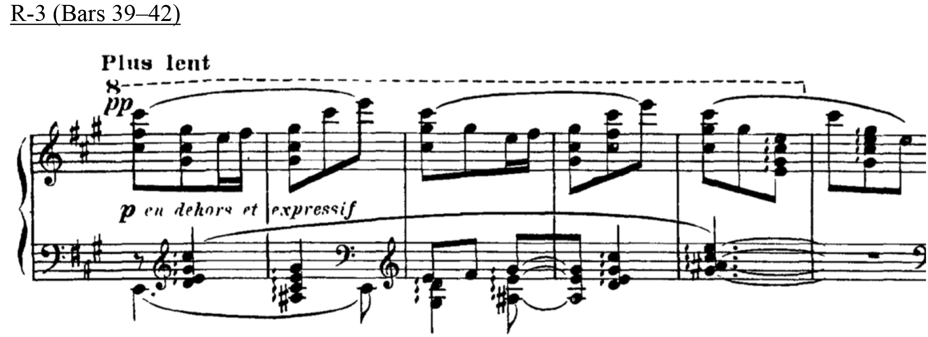 Similarly, with R-3-6, which also contains a small tension rating value, this is supported by a large value from the model, AVL 13, and this also marks a shift from a PCn containing four notes in a chord to a single note. At this point in the music, R-3-6 coincides with the end of the two-bar figure, where both treble and bass arrive on E. This highlights the importance of the slur marking in bar 40, to phrase off that particular moment. Therefore, in this instance, the lower tension rating value perceived by listeners can be accounted for in conjunction with other surrounding musical parameters. 24